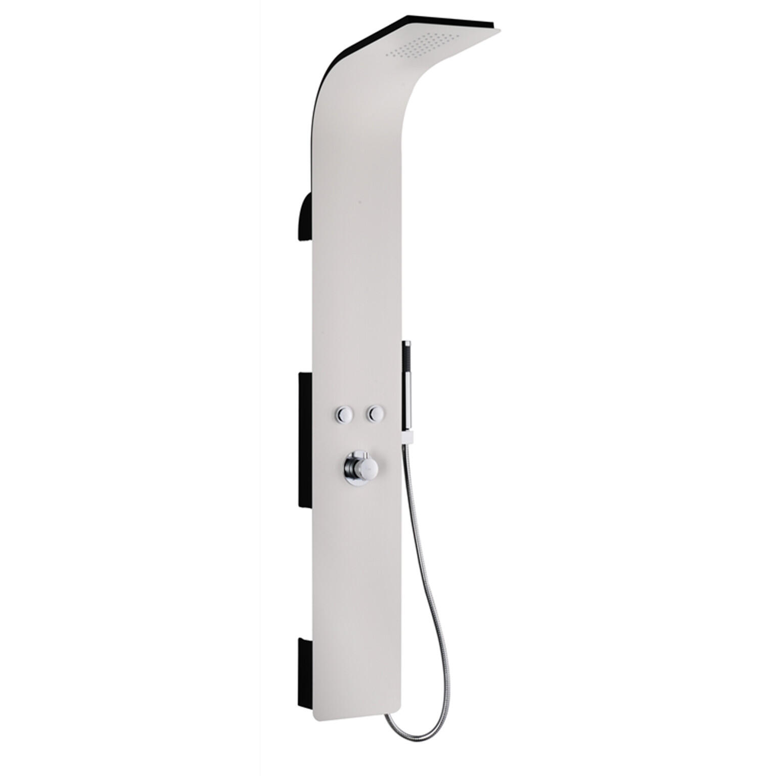 Panneau en alu blanc hauteur 1500mm Mitigeur mécanique cartouche céramique 40mm Pomme de tête intégrée Douchette chromée en ABS 1 jet Flexible de douchette en PVC gris 150cm Etagères porte flacons au dos du panneau accessibles sur le côté