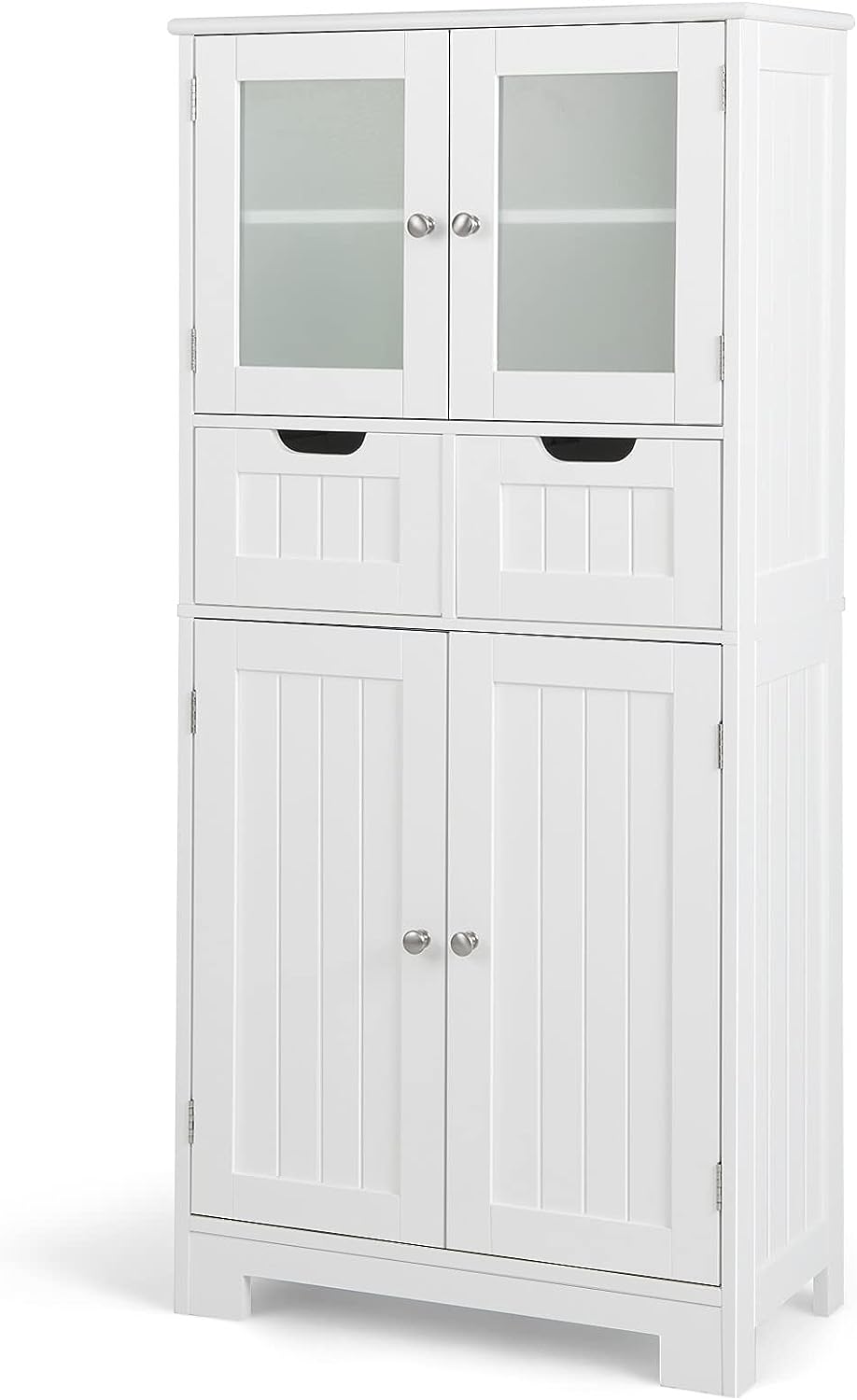 - 【Matériau sélectionné: 】Fabriqué à partir de MDF de haute qualité avec surface peinte, ce meuble de rangement de salle de bain assure une utilisation durable, une forte stabilité. Les portes supérieures en verre dépoli trempé a une dureté élevée et une bonne résistance à l’éclatement.
