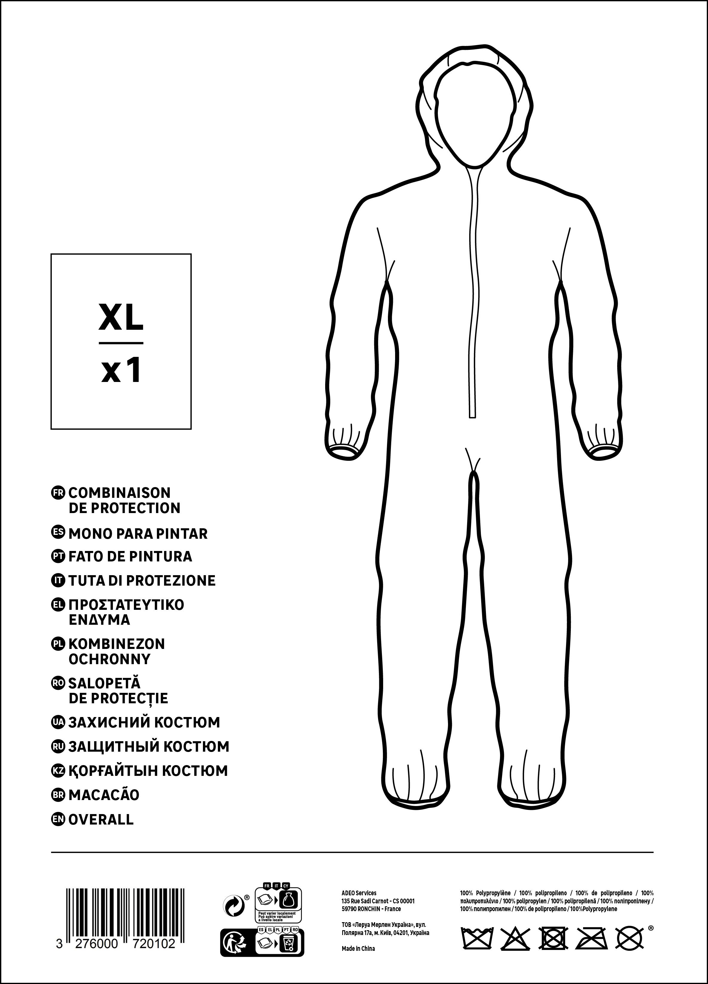 Combinaison de protection taille XL avec fermeture éclair. Convient pour des travaux intérieurs ou extérieurs. Protège de la poussière et des projections de peinture.
