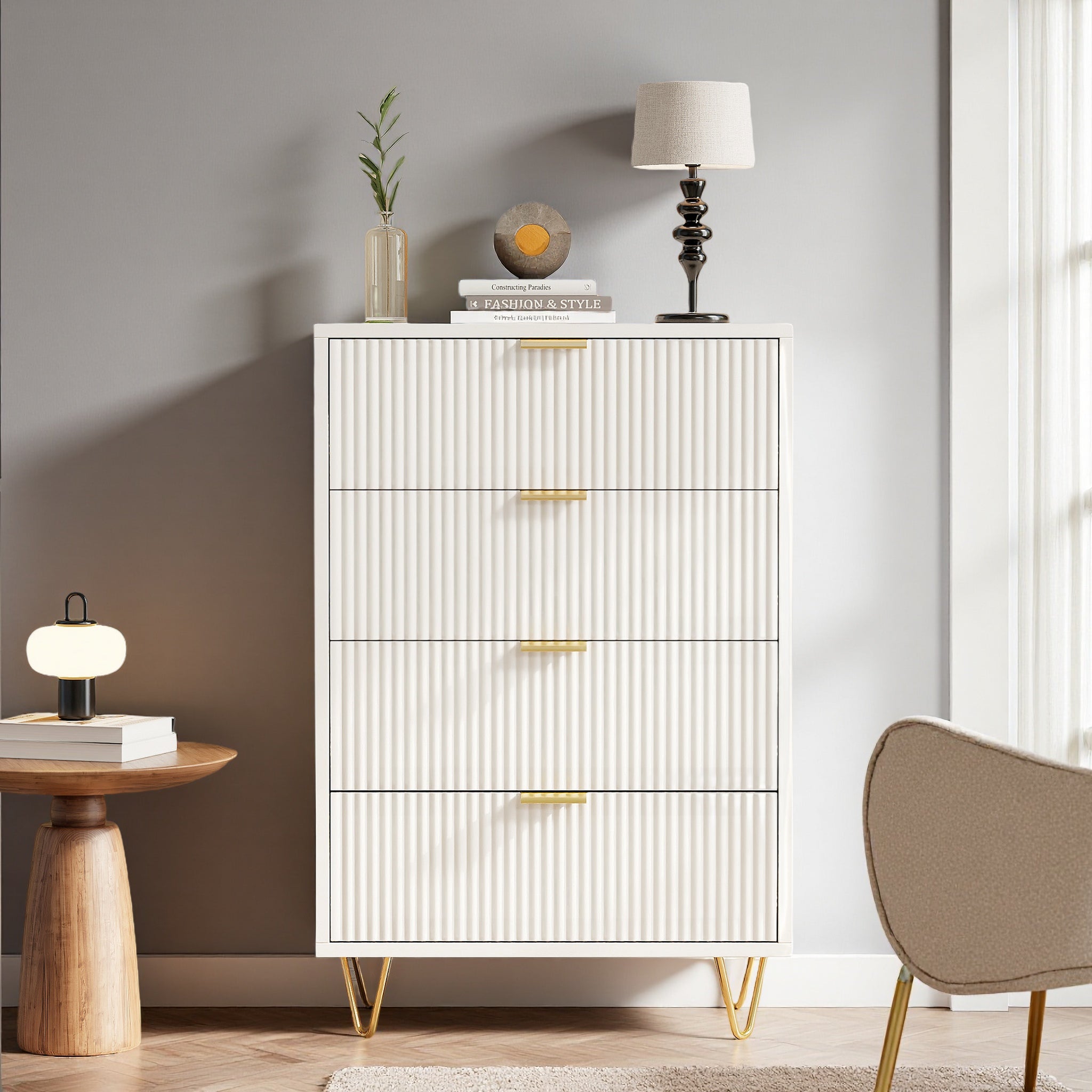 Commode 4 tiroirs blanche avec façade à motif ondulé, poignées dorées et pieds en métal, style moderne, grand espace de rangement