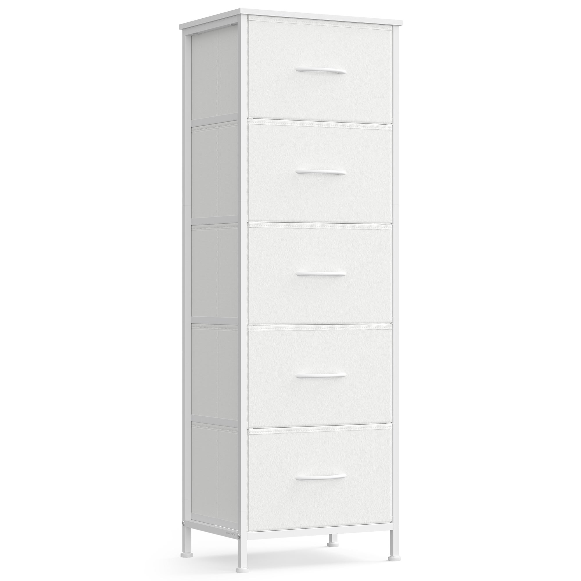 Commode 5 Tiroirs, Meuble de Rangement pour Chambre, Acier, Panneau MDF, Tissu non-tissé, pour Couloir, Entrée, Salon, Blanc Nuage et Blanc Neige