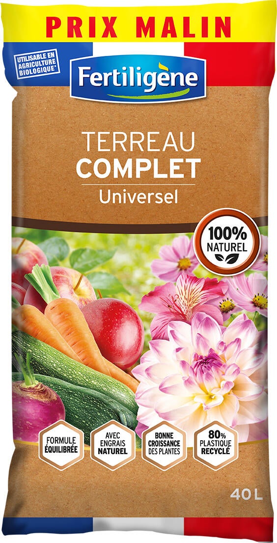 Le terreau complet universel de Fertiligène est idéal pour toutes les cultures (de la maison ou du jardin), en pots ou en pleine terre. Sa formule équilibrée, enrichie en engrais organique, est 100% naturelle et apportera aux plantes tous les éléments nécessaires pour une bonne croissance. Son sac est fabriqué à 80% de plastique recyclé post-consommation et est recyclable. Il est utilisable en agriculture biologique*.