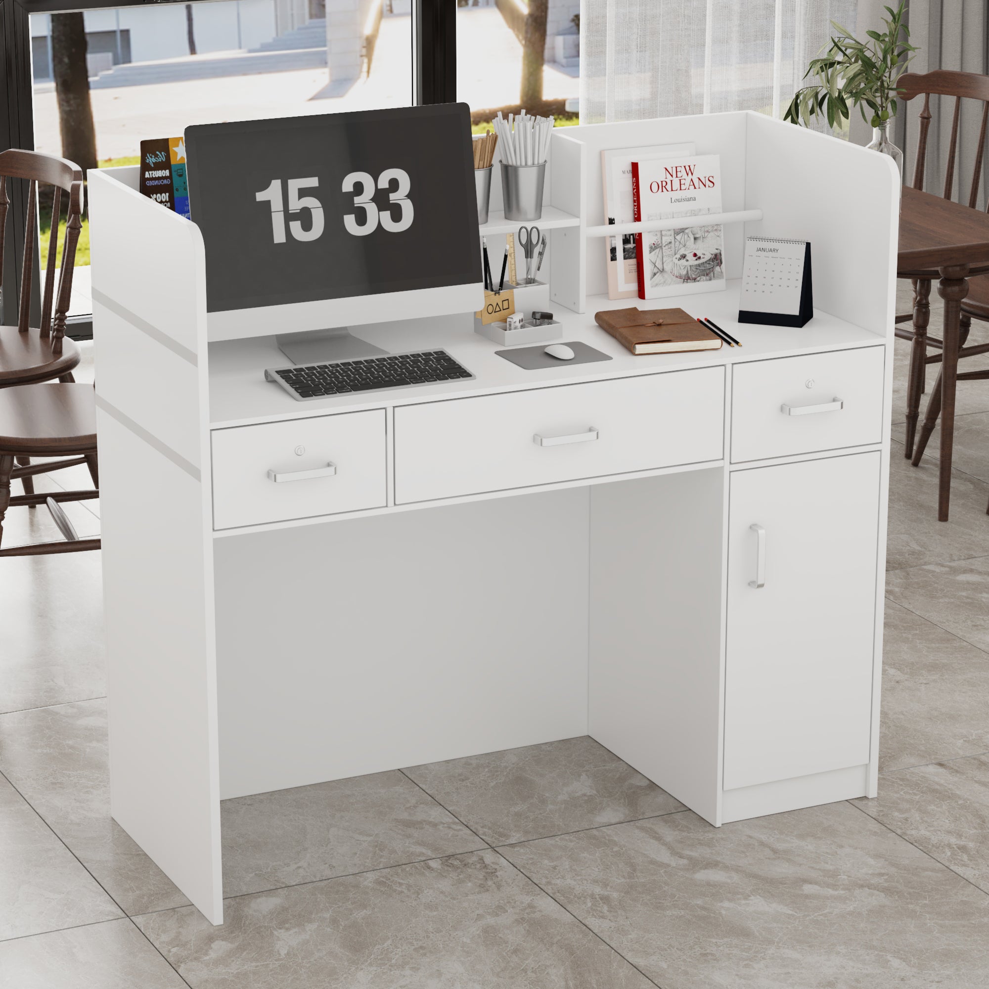 [Haute qualité] La table de réception est principalement fabriquée en MDF de haute qualité, stable et durable. Il utilise des matériaux sans couleur, résistants aux intempéries et imperméables et peuvent être utilisés pendant une longue période. Les tiroirs avec rails permettent un glissement et une traction en douceur.