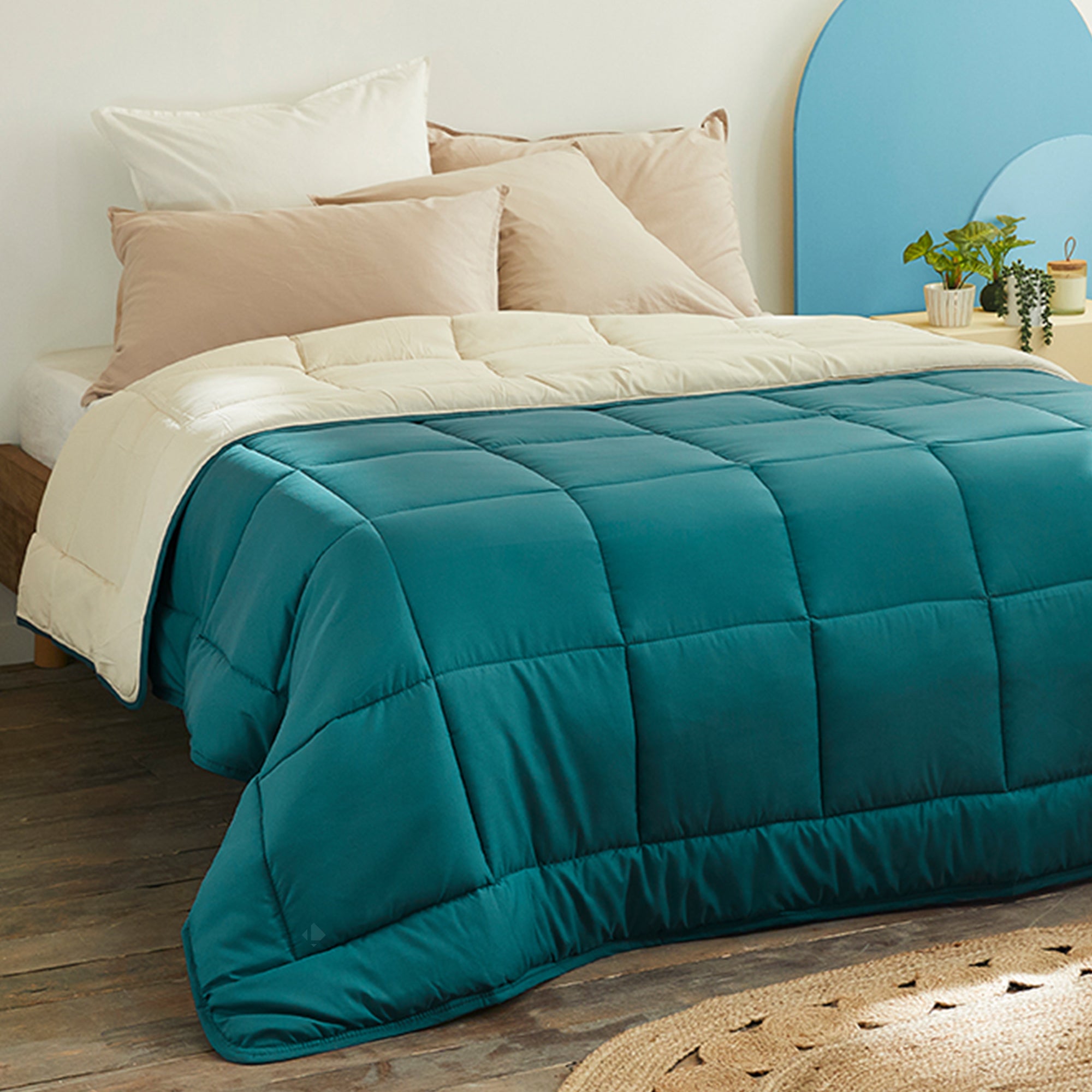 La couette hiver 400 g/m2 COCOON BICOLORE coloris Bleu paon/Galet offre une respirabilité parfaite avec son enveloppe microfibre et un toucher peau de pêche très doux. Son garnissage léger en fibre creuse mais gonflant laisse passer l'air pour une régulation parfaite de la température et pour éviter toute transpiration.