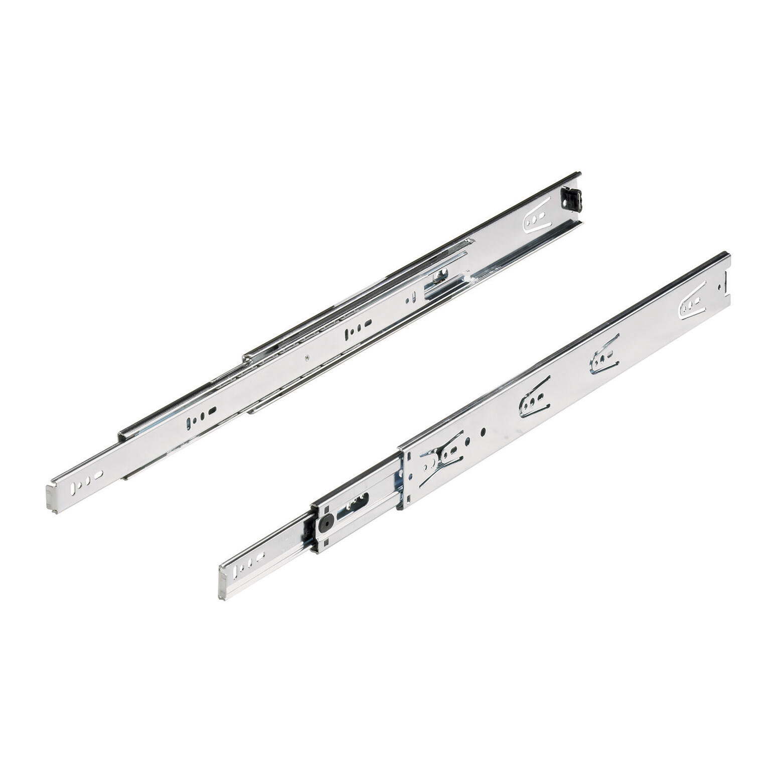 Guide télescopique fixe en acier galvanisé avec billes à ouverture totale. Supporte une charge maximale de 45 kg. Empattement : 442 mm. Longueur du tiroir : 50 cm.