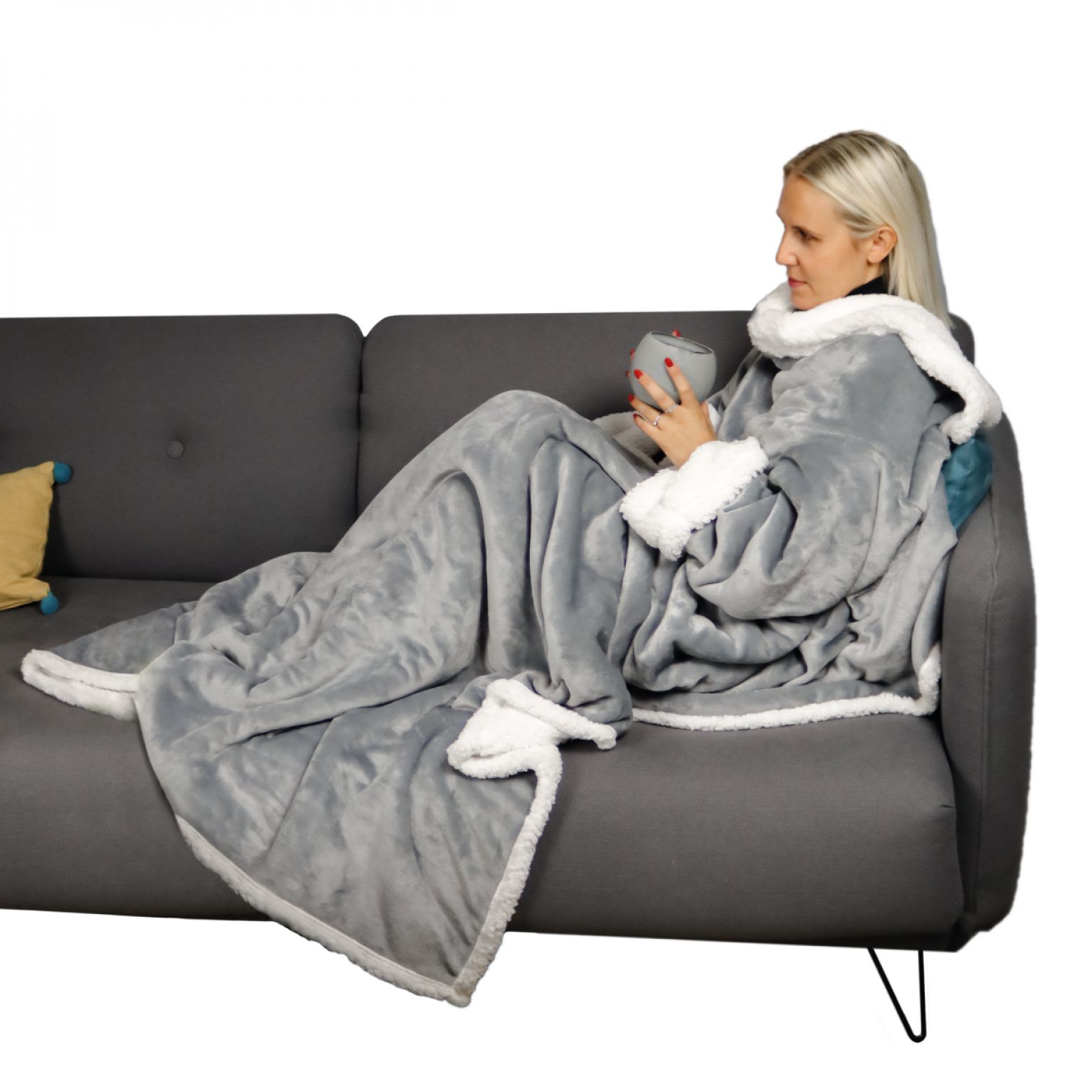 Couverture polaire, plaid intégral avec manches et poche - 140 x 210 cm - Sherpa et flanelle - Adulte - Gris - Vivezen
