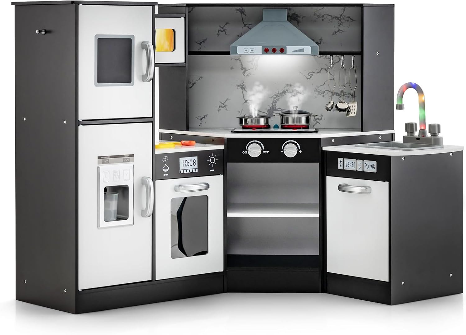 - ——Multiples aires de jeu amusantes : Conçue avec une installation réaliste et sophistiquée comprenant une machine à glaçons, un four, un lave-vaisselle, une hotte et plus encore, cette cuisine permet aux enfants de s'immerger dans des jeux de cuisine amusants. En outre, ils peuvent dessiner ou écrire sur le tableau pour stimuler leur imagination et leur créativité.