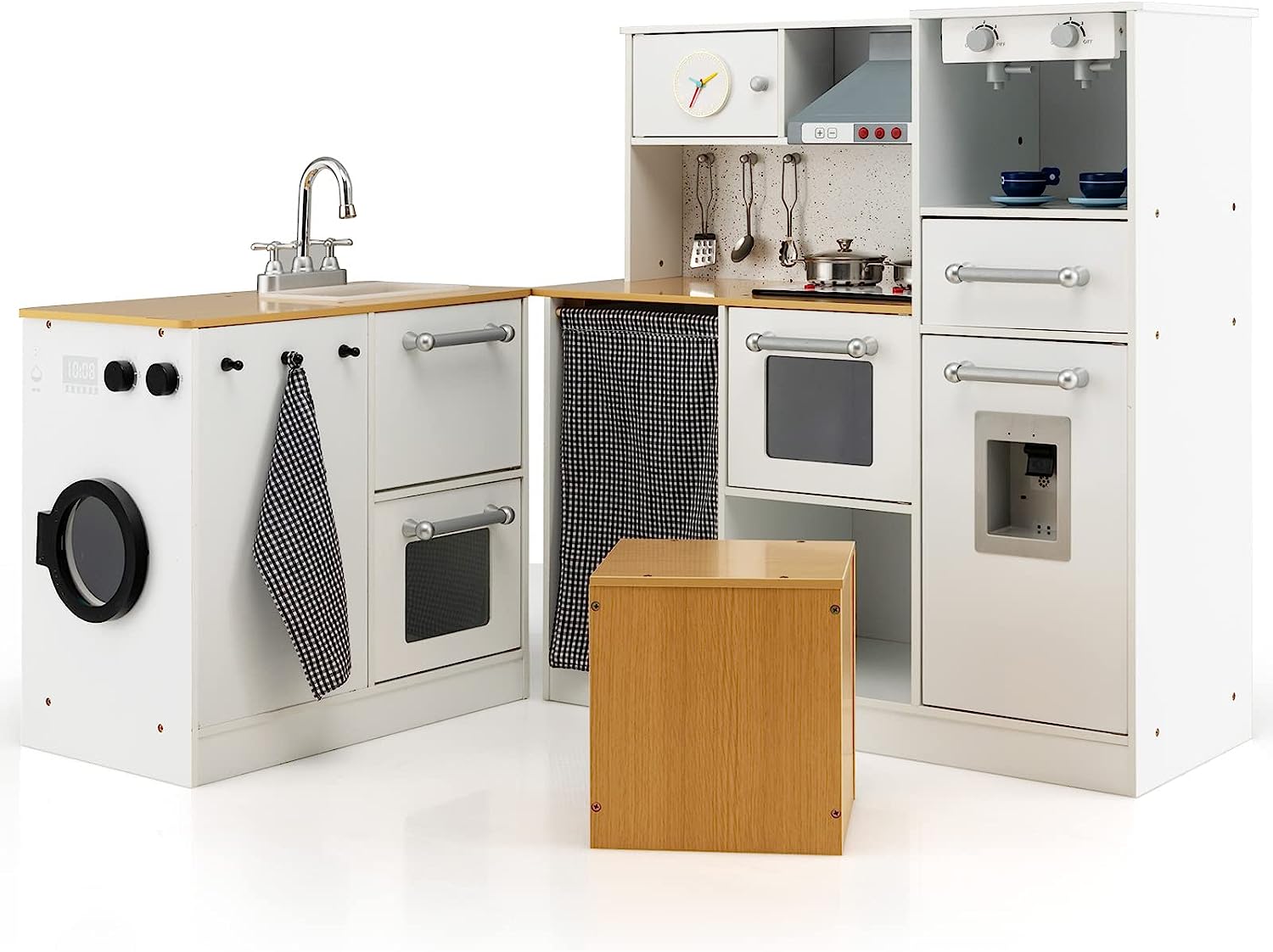 Cuisine Enfants Bois ,Jeux d’Imitation Cuisinière avec Machine à Laver, Sons et Lumière Réels,Tabouret,Cafetière,Distributeur d'eau, Blanc