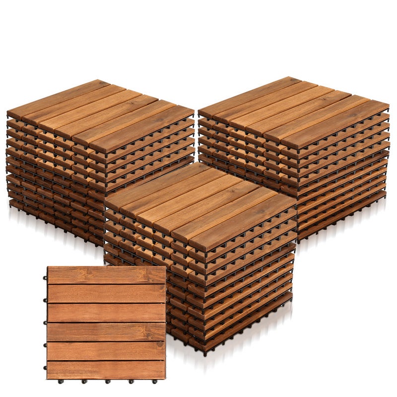 Fabriquées en bois d’acacia certifié FSC, reconnues pour leur solidité et leur résistance aux intempéries. Le dessous des dalles a été spécialement renforcé pour prévenir toute casse. Les dalles sont disponibles en taille 30 x 30 cm et offrent une ace solide et stable.