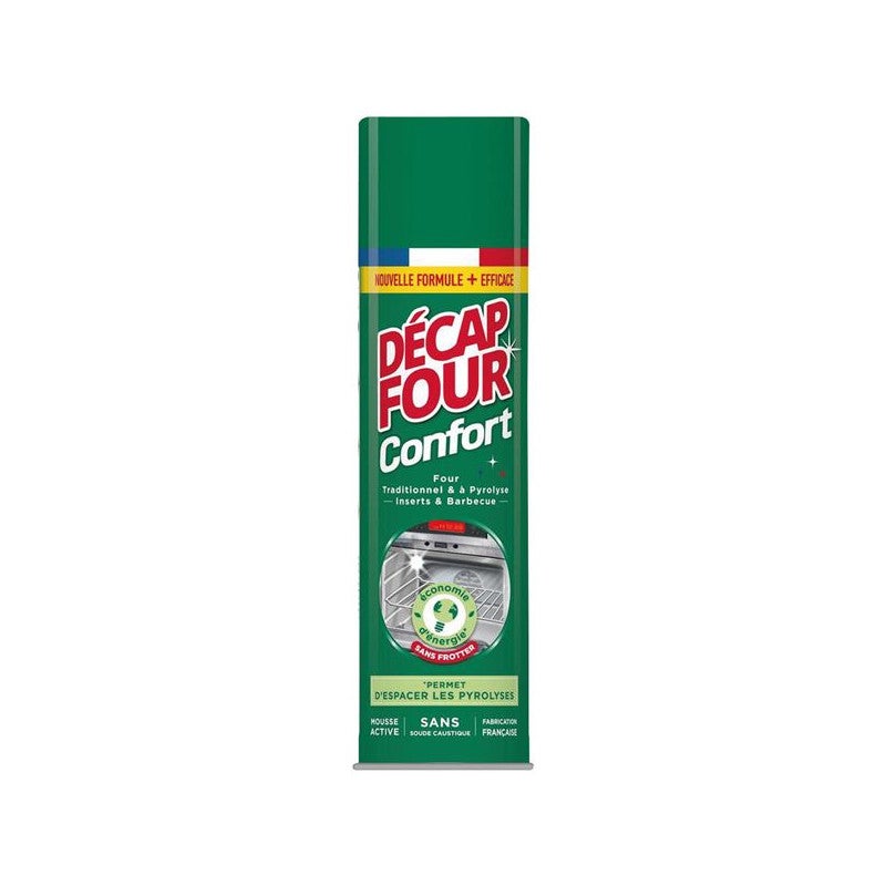 La mousse active de DECAP'FOUR Confort pénètre et décolle les dépôts de graisse brûlée pour faciliter l'élimination des suies et résidus incrustés. Sa formule rapide permet des résultats visibles en quelques minutes sur les salissures récentes et un dégorgement plus profond sur les incrustations tenaces.