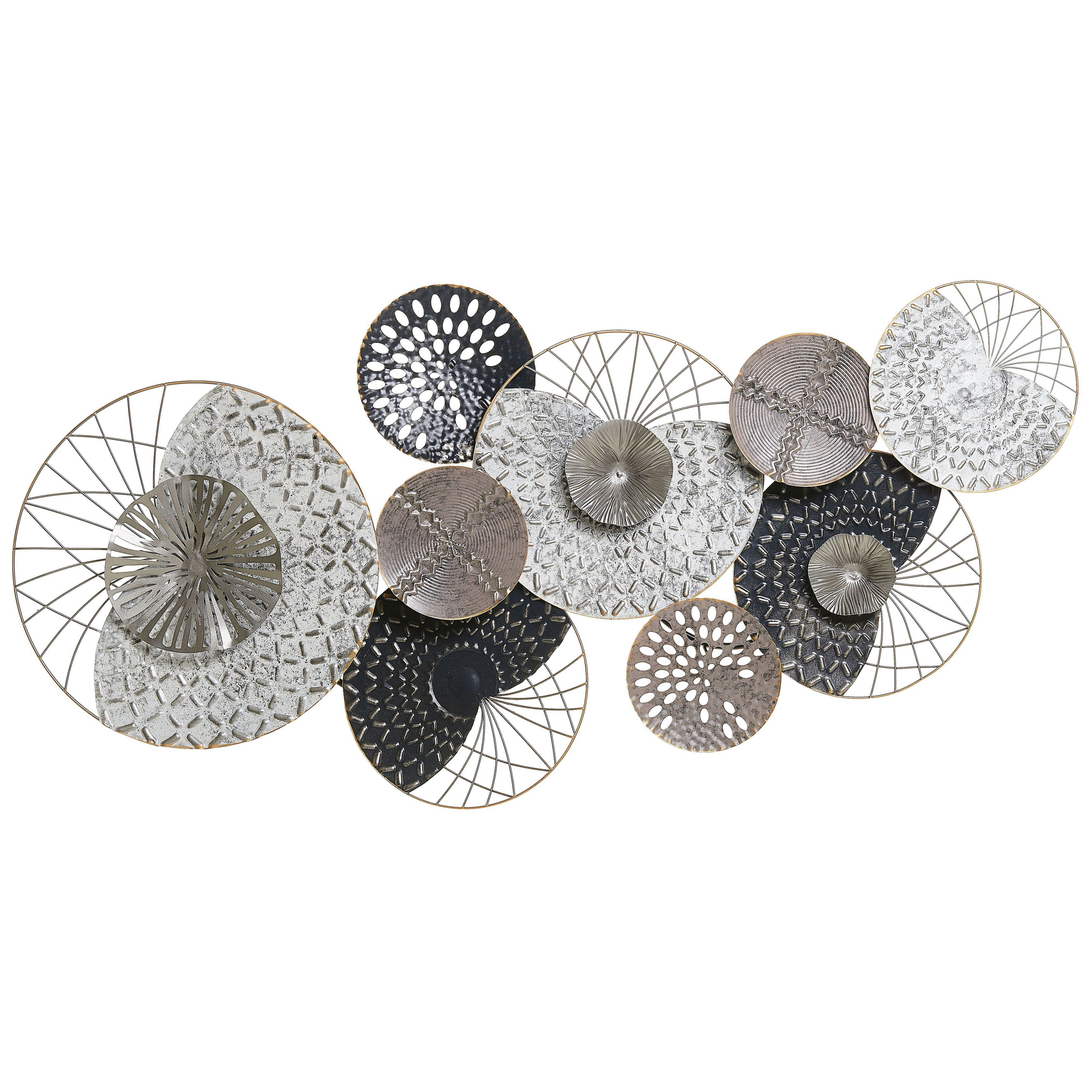 Cette décoration murale, composée de cercles argentés, noirs ou cuivrés, ajoutera une touche industrielle au look de votre salon ou salle à manger. Bien que réalisée en métal resistant, cette pièce semble délicate grâce à sa finition et son aspect légérement vieilli et pourra s'intégrer facilement parmi vos meubles. De plus, cette décoration possède des crochets intégrés pour une accroche facile et peut être posée horizontalement ou verticalement.