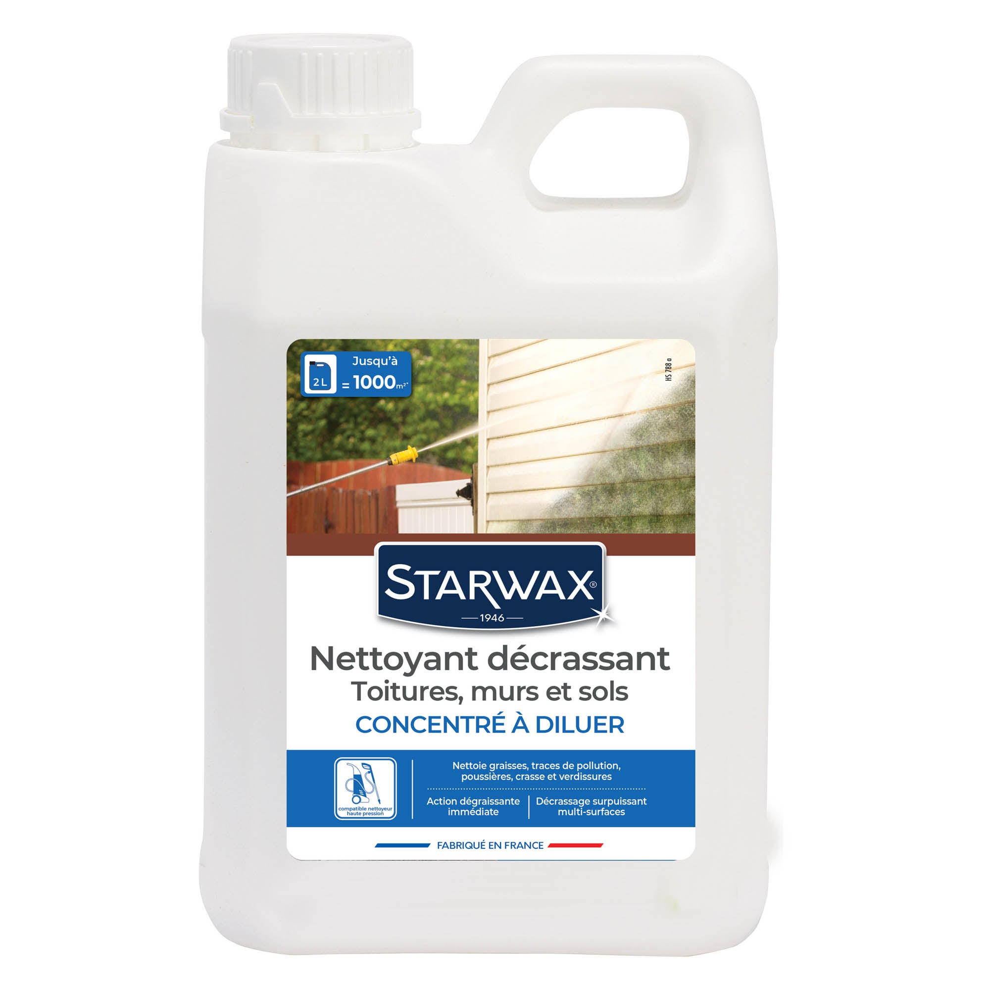 Le nettoyant décrassant concentré Starwax nettoie sans efforts graisses, suies, poussières, salissures tenaces et verdissures, Il est aussi efficace sur les taches d’huiles de moteur, de graisse et les projections alimentaires dues à l’utilisation de barbecue et plancha, Nettoyant multi-supports, il est idéal pour les toitures, les murs et les sols, De plus, il est compatible avec tous types de nettoyeurs haute pression et est facile à rincer. Existe également en format 1L.