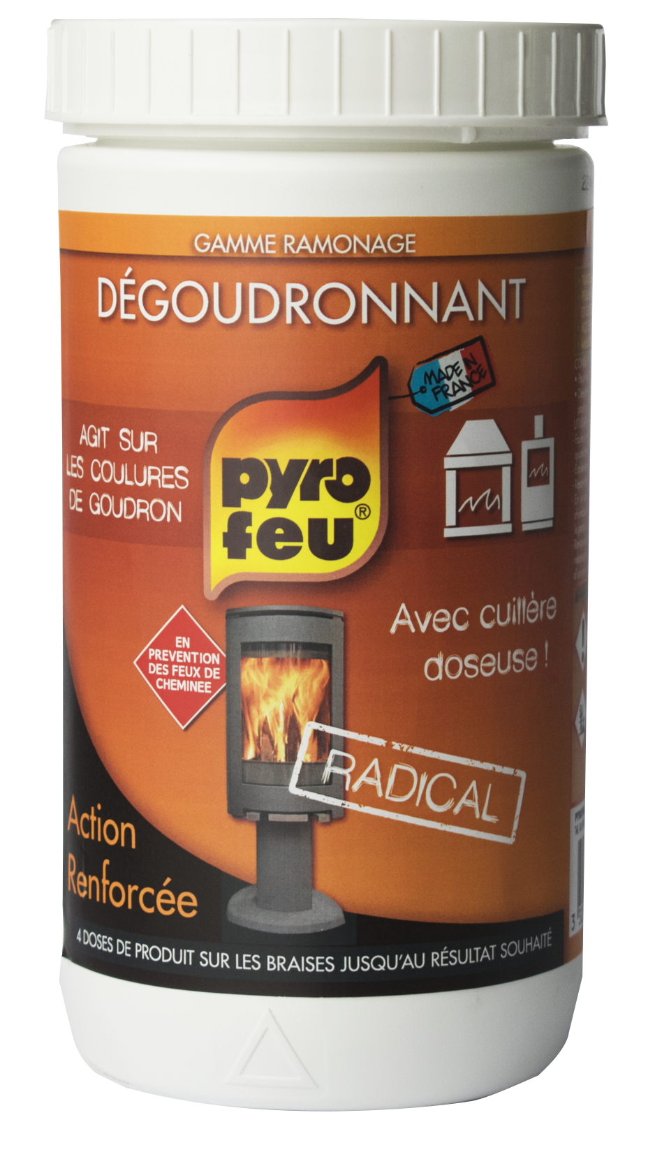 Pot 800g. 100% matière active ! Elimine le goudron présent dans le poêle/ insert et le conduit. La cuillère permet de doser et de verser la matière active dans les zones les plus encrassées.