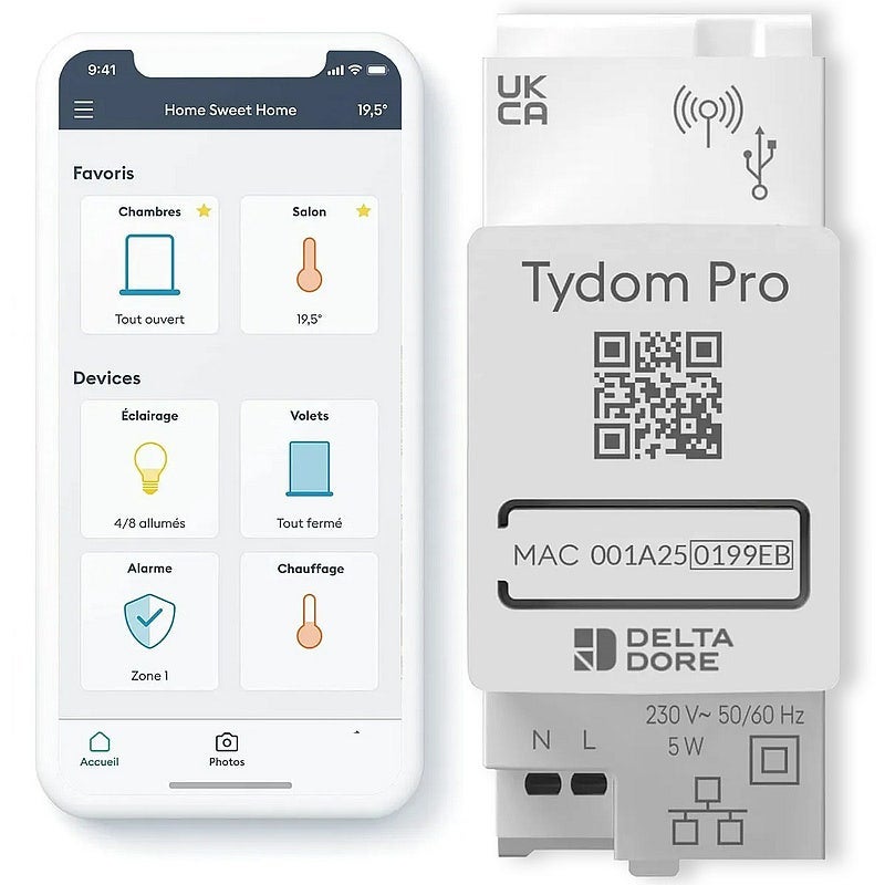 Box maison connectée Tydom Pro référence 6700117 de la marque Delta Dore Contrôle à distance : gestion avec votre smartphone, tablette ou à la voix des vos équipements de la maison connectée grâce à la box domotique Tydom Pro et l'application Tydom Multiples usages : protection de la famille et des bien, gestion du confort thermique, automatisation des ouvrants et occultants, pilotage des éclairages et affichage des consommations. Visualisation en temps réel : visualisation de tous vos équipements connectés en temps réel avec l'application. Routines planifiées : création de routines planifiées ou à la demande, adaptées à votre rythme de vie (arrivée, départ...). Installation invisible : box installé dans le tableau électrique avec 2 modules uniquement Application gratuite et sans abonnement : application disponible sur l'App Store (IOS) et Android. Inclus : 1 box maison connectée Tydom Pro, 1 câble Ethernet et la notice d'installation Offre large de 400 produits Delta Dore et partenaires pilotables via l'application Tydom Pour une installation plus simple, évitant toute intervention dans le tableau électrique, découvrez la box Tydom Home