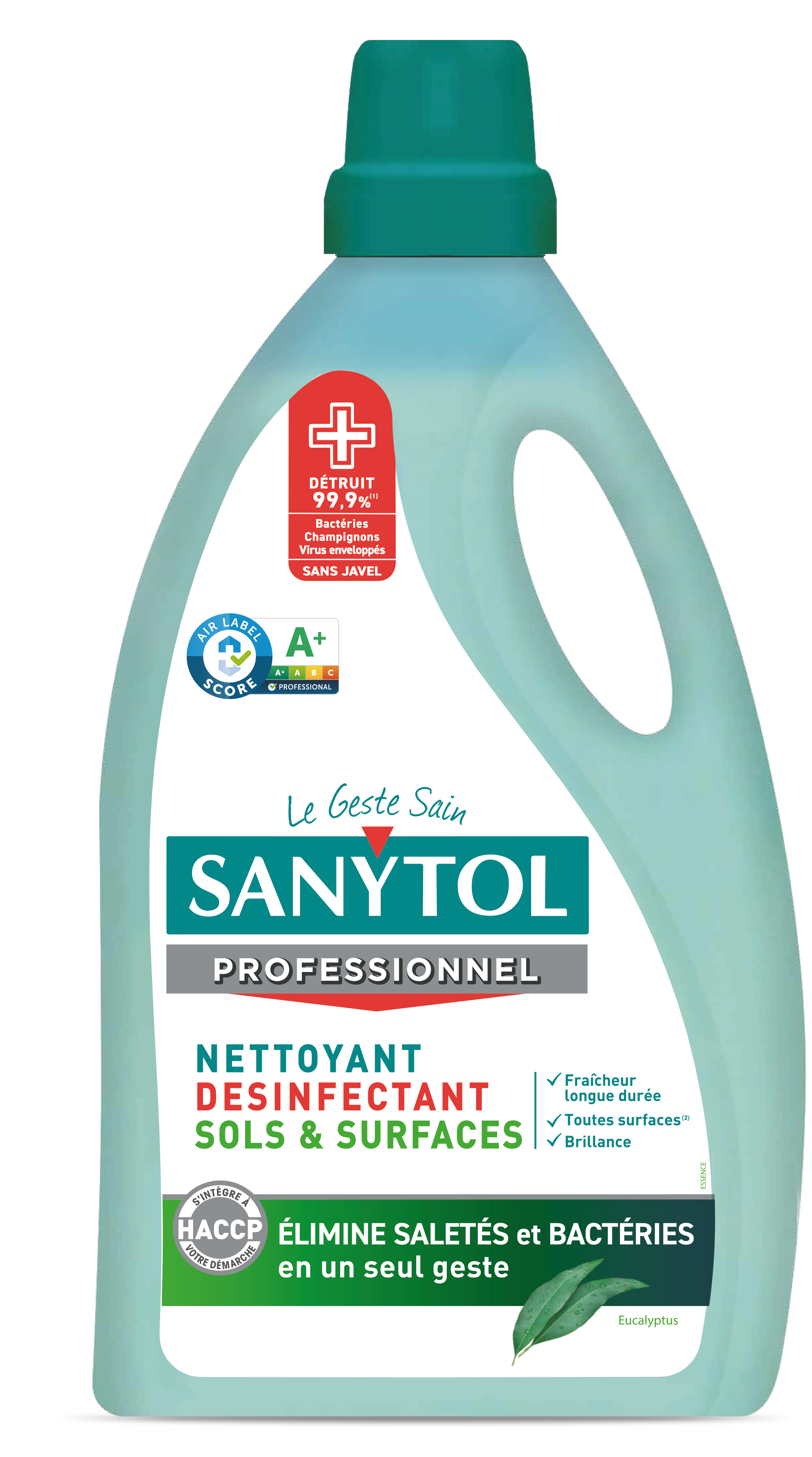 Dégraisse, assainit et parfume durablement. Détruit 99.9% des bactéries, virus H1N1, Covid-19 et champignons sans javel. Respecte les surfaces. Adapté aux surfaces alimentaires. Parfum Eucalyptus.