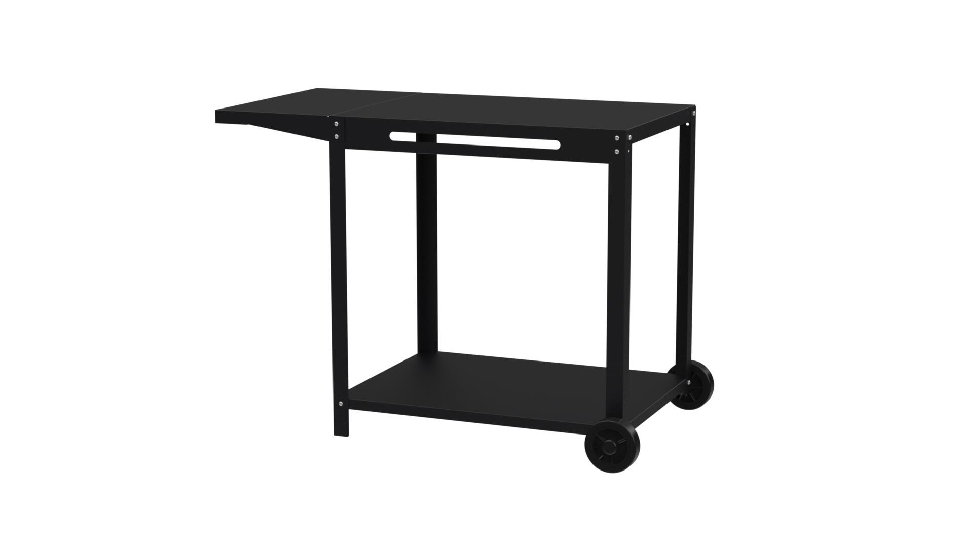. 2 plateaux . 1 tablette latérale . 1 porte-torchon en façade . 2 roues . À monter soi-même . En version acier électrozingué coloris noir . Garantie 2 ans . Certification Origine France Garantie . L108 P64 H77 cm . Poids : 14 kg