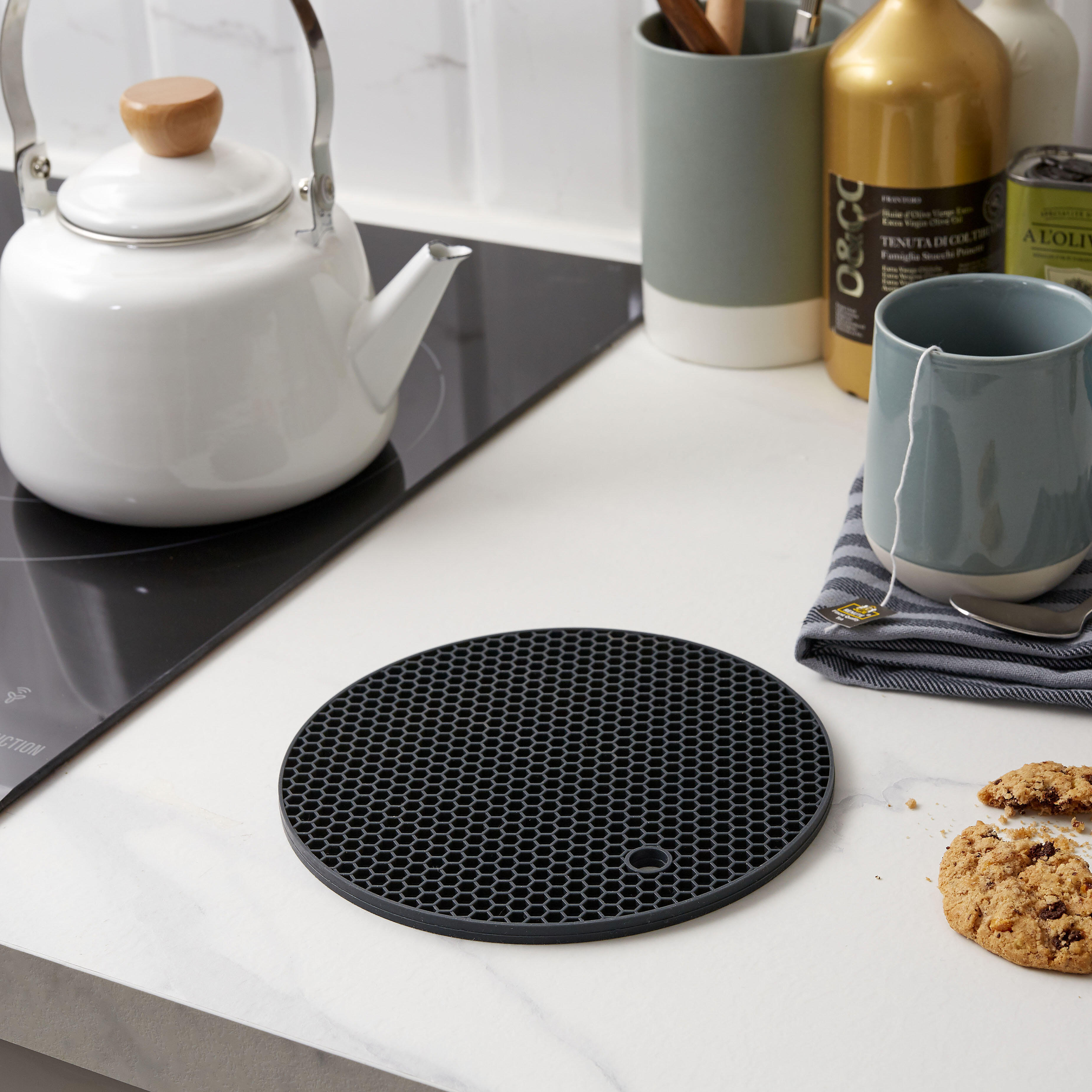 Repose plats rond Delinia en silicone gris foncé. Conçu pour placer des casseroles, des cocottes ou des plats chauds et ainsi éviter qu'ils n'endommagent le plan de travail. Dimensions : 18 cm de diamètre.