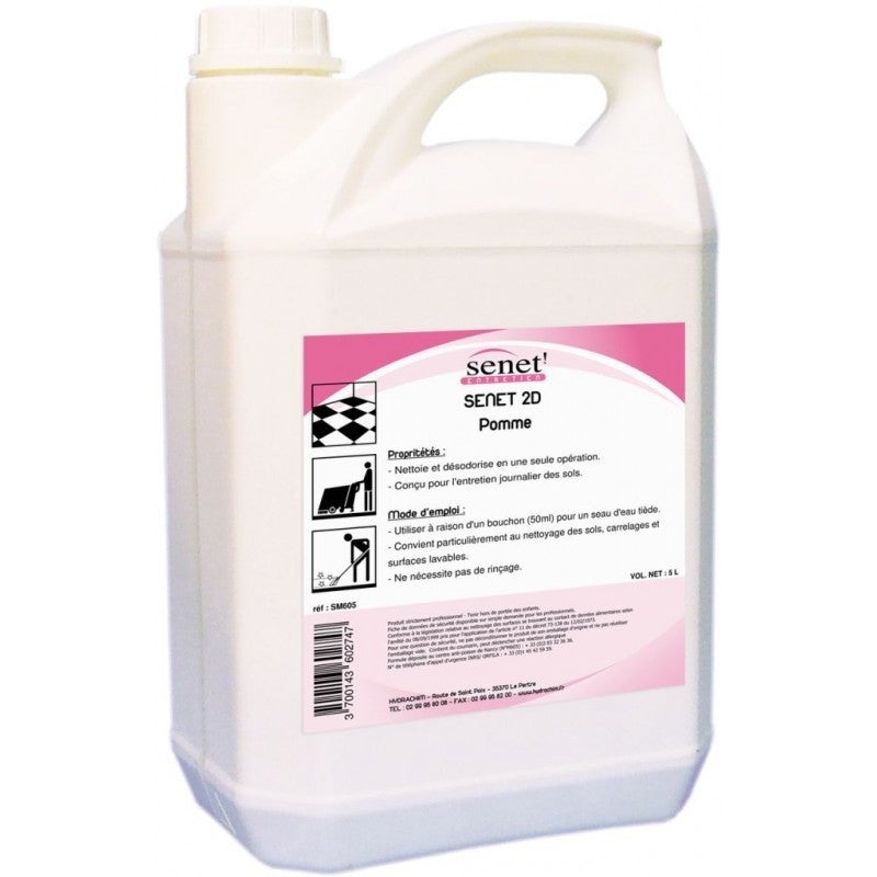 Les SENET 2D sont des détergents surodorant développés pour nettoyer et désodoriser les sols. Ce sont des produits qui sont utilisés pour l’entretien journalier des sols. Les SENET 2D convient particulièrement au nettoyage des sols, carrelages et surfaces dures lavables. Il ne nécessite pas de rinçage et laisse une agréable odeur, pH : 6 +/- 1. Produit réservé à usage professionnel. Mode d'emploi : Dose d'emploi : 1 bouchon doseur de 50ml de SENET 2D pour 8 litres d'eau chaude ou froide (dilution de 0,6%). Le bouchon du bidon est un bouchon doseur gradué jusqu'à 50ml. Avec 5 litres de SENET 2D correspond à 833L de produit fini. Utilisation manuellement ou en auto laveuse, pas de rinçage. Ce mélange ne présente pas de danger physique. Voir les préconisations concernant les autres produits présents dans le local.