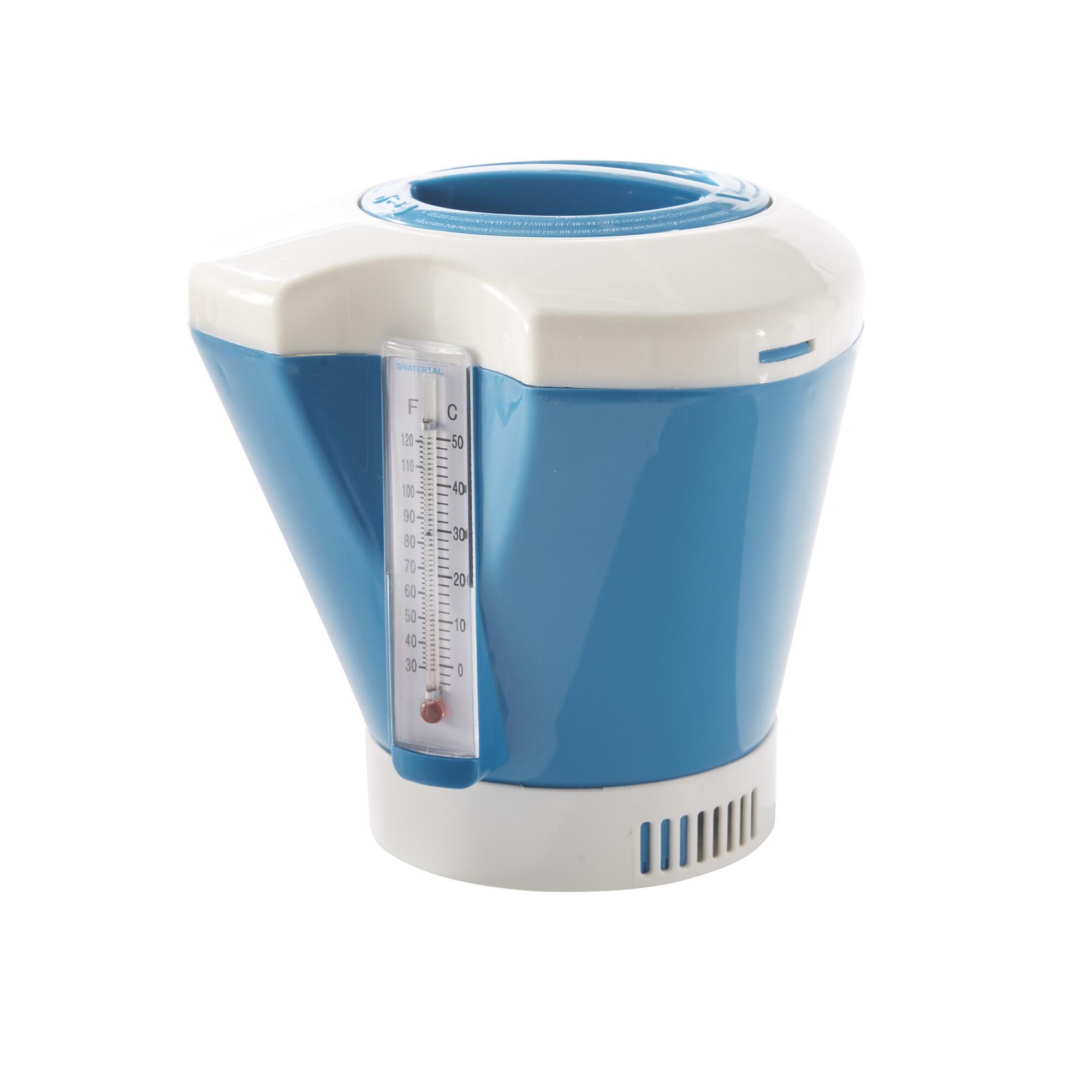 Diffuseur flottante pour le traitement chimique des piscines. Avec une capacité de 5 galets de chlore ou de brome de 200 grammes et la possibilité d'en ajuster le niveau de dosage. Il intègre également un thermomètre qui affiche les valeurs en ºC et ºF