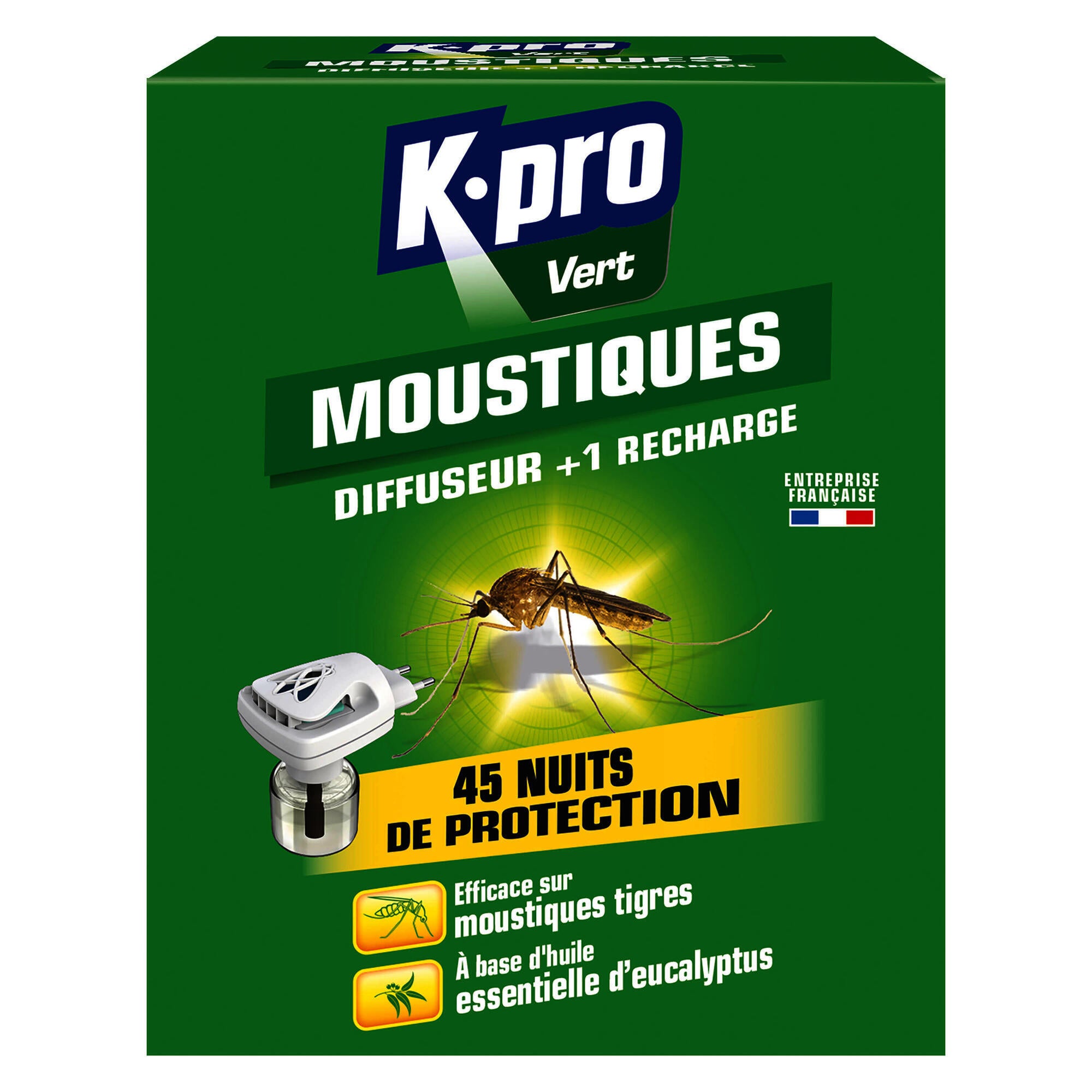 Le diffuseur moustiques K.pro Vert vous protège des moustiques et moustiques tigres grâce à son actif à base d’huile essentielle d’Eucalyptus. Il est efficace pendant 45 nuits de 8h. L’efficacité commence 1h après le branchement. Utiliser un émanateur pour une pièce de 8 m² environ 20 m3
