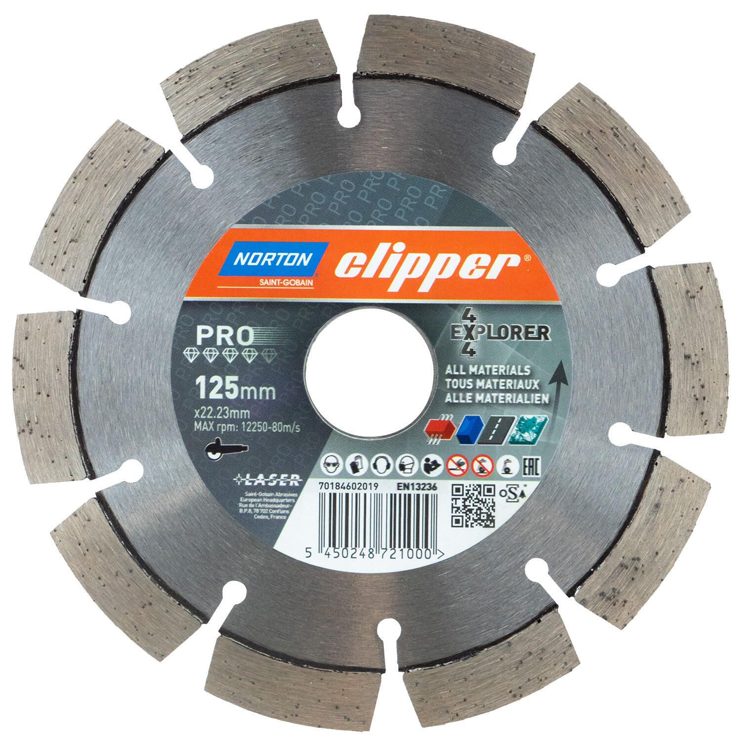 Disque diamanté de 125 mm à jante segmentée. Indiqué pour les trottoirs en béton, le béton, le granit, l'asphalte et les métaux d'une épaisseur ne dépassant pas 5 mm.