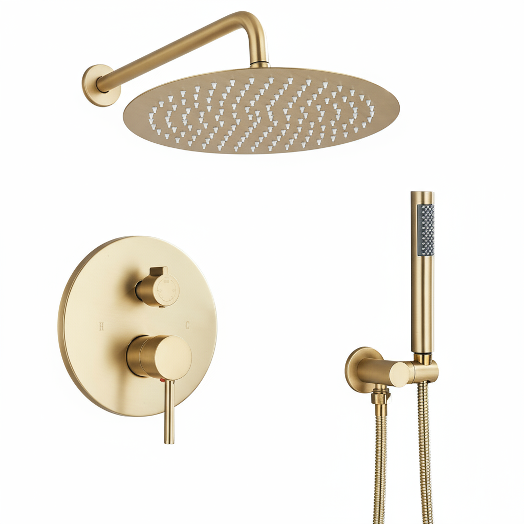 Douche Encastrée Classique Dorée Brossé, Tête XXL 30 cm Effet Pluie, Mitigeur Intégré et Douchette