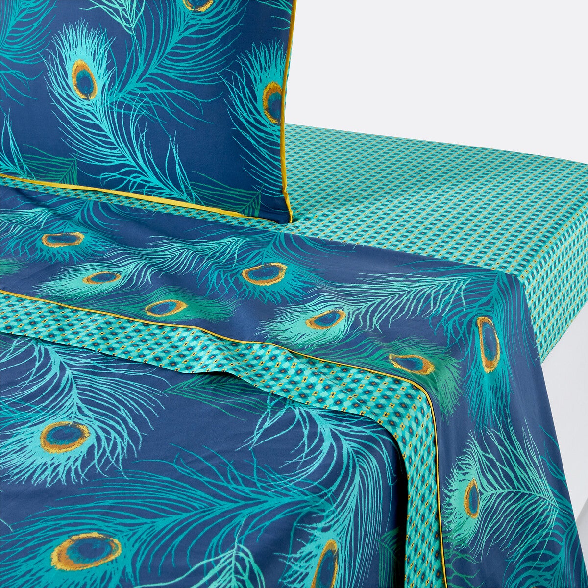Le drap percale SHAKHRA. Élégance et légèreté des plumes de paons, richesse des tons et contrastes des motifs, le drap imprimé SHAKHRA saura séduire les amateurs de belles matières.La percale de coton offre une agréable sensation de fraîcheur et de légèreté. Son tissage serré la rend particulièrement douce pour un confort premium. Une matière mate, lisse et craquante qui s'assouplira au fil des lavages.