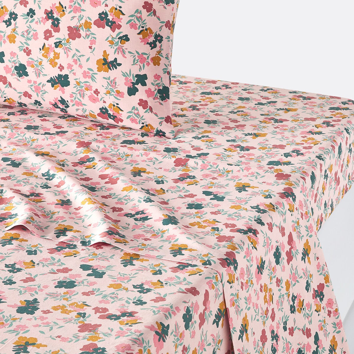 Drap plat coton lavé, Callas - Imprimé fond rose - 180 x 290 cm