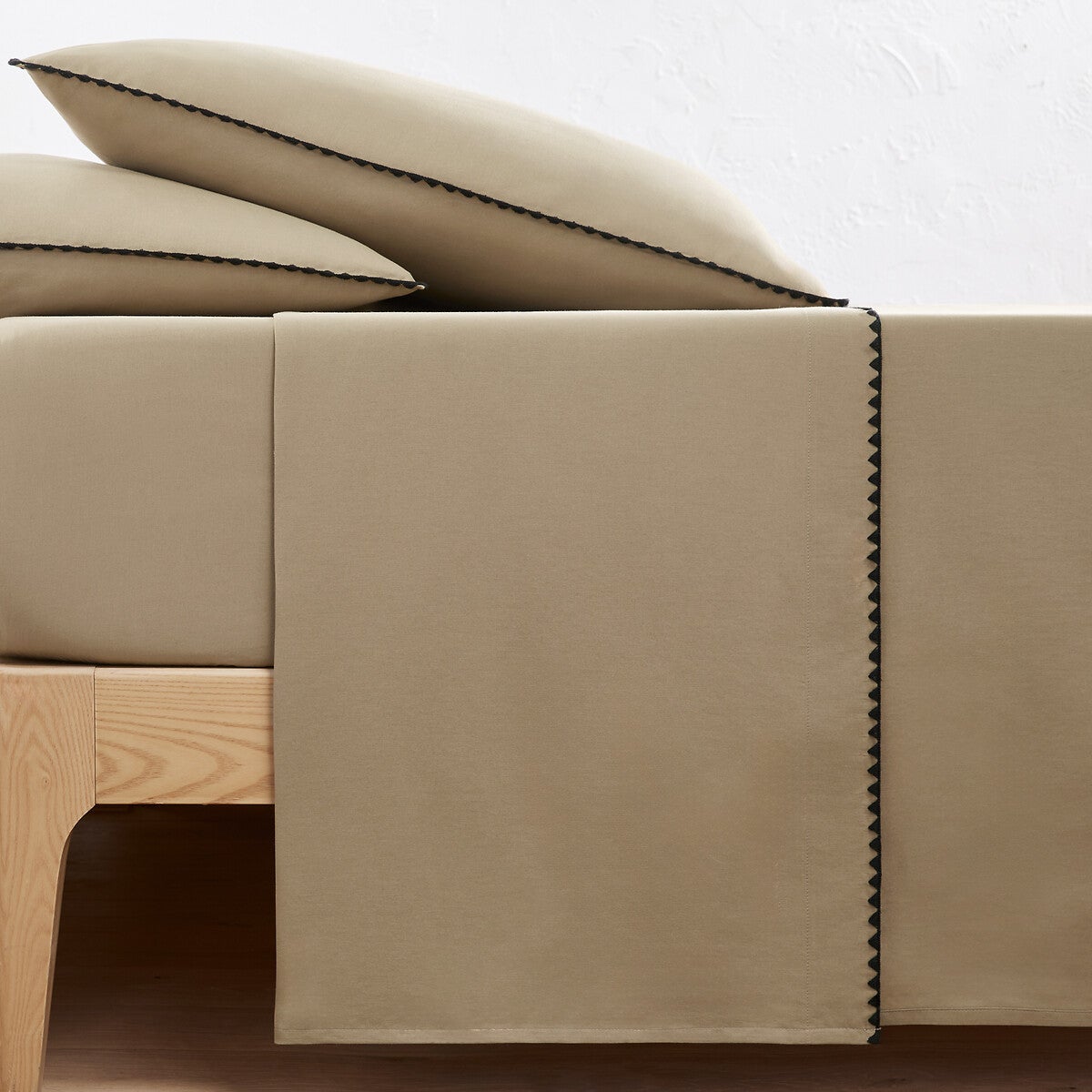 Drap plat uni en coton lavé, brodé, Merida - Lin/noir - 180 x 290 cm