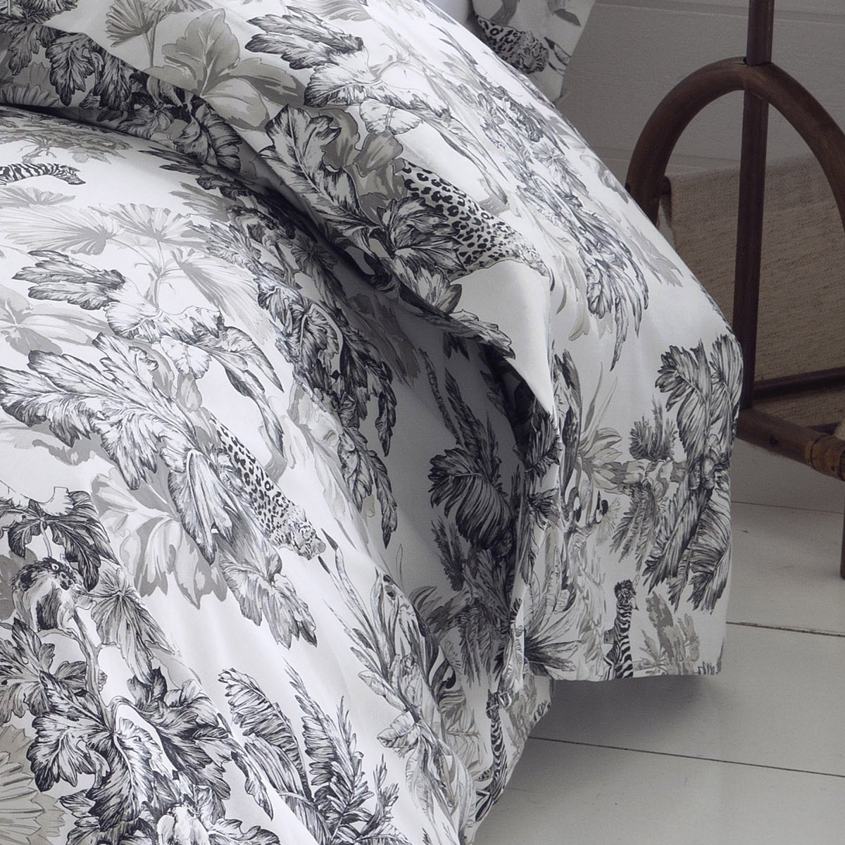 Pourquoi ne pas vous fondre au cœur de la jungle avec la collection Savane, en pur satin de coton peigné extrêmement fin et serré, 110 fils/cm², qualité supérieure. Elle se distingue par sa grande douceur, son bel aspect soyeux et sa tenue parfaite. Ce drap aux imprimés exotiques déclinés dans les tons de noir, de gris foncé et de gris clair sur fond blanc, offrira un souffle de sérénité pour votre chambre.- Motif exotique all over.