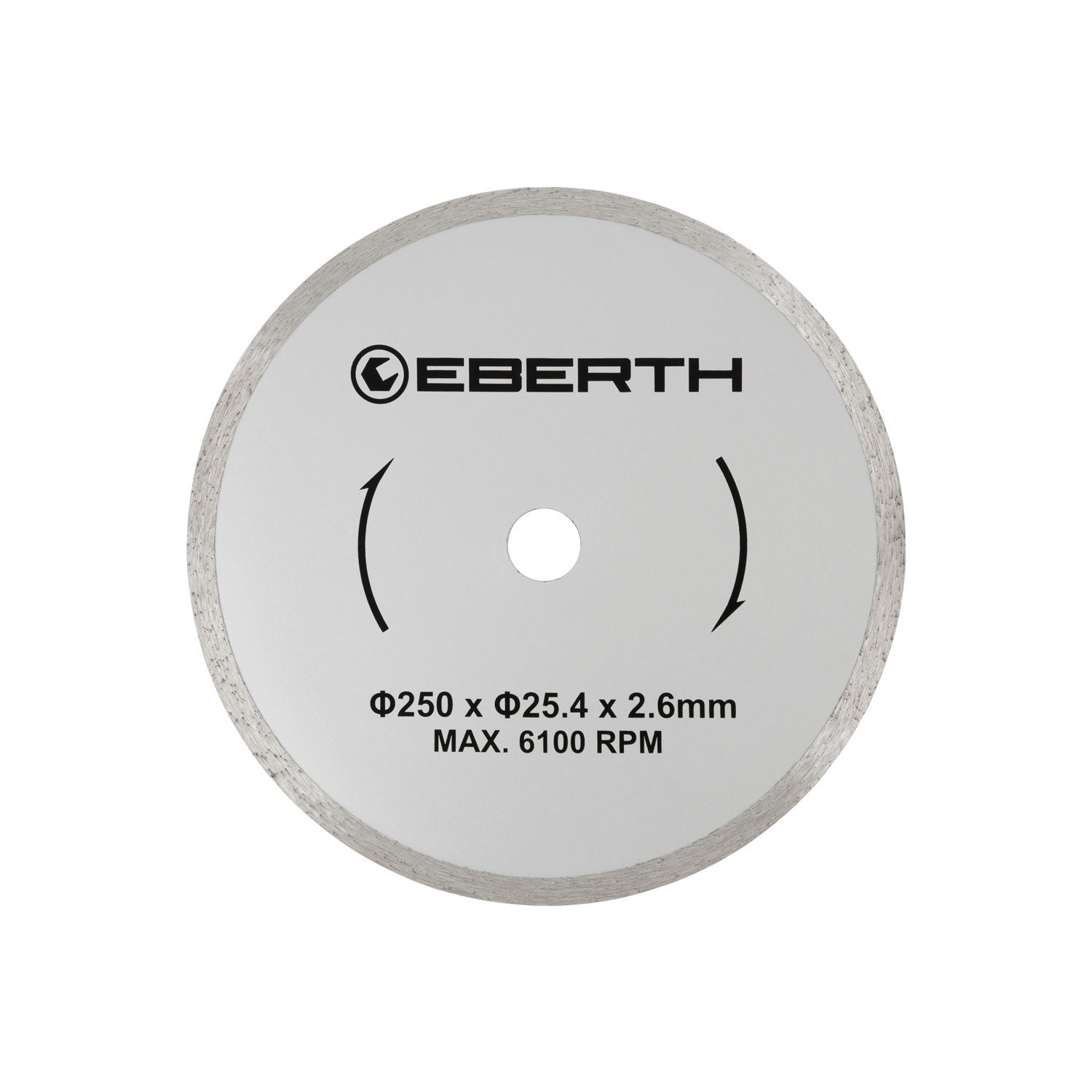 Le disque à tronçonner diamanté EBERTH a un diamètre total de 250 mm, l'alésage a un diamètre de 25,4 mm et l'épaisseur de la lame est de 2,6 mm. La vitesse de travail maximale est de 6100 RPM (tours par minute)
