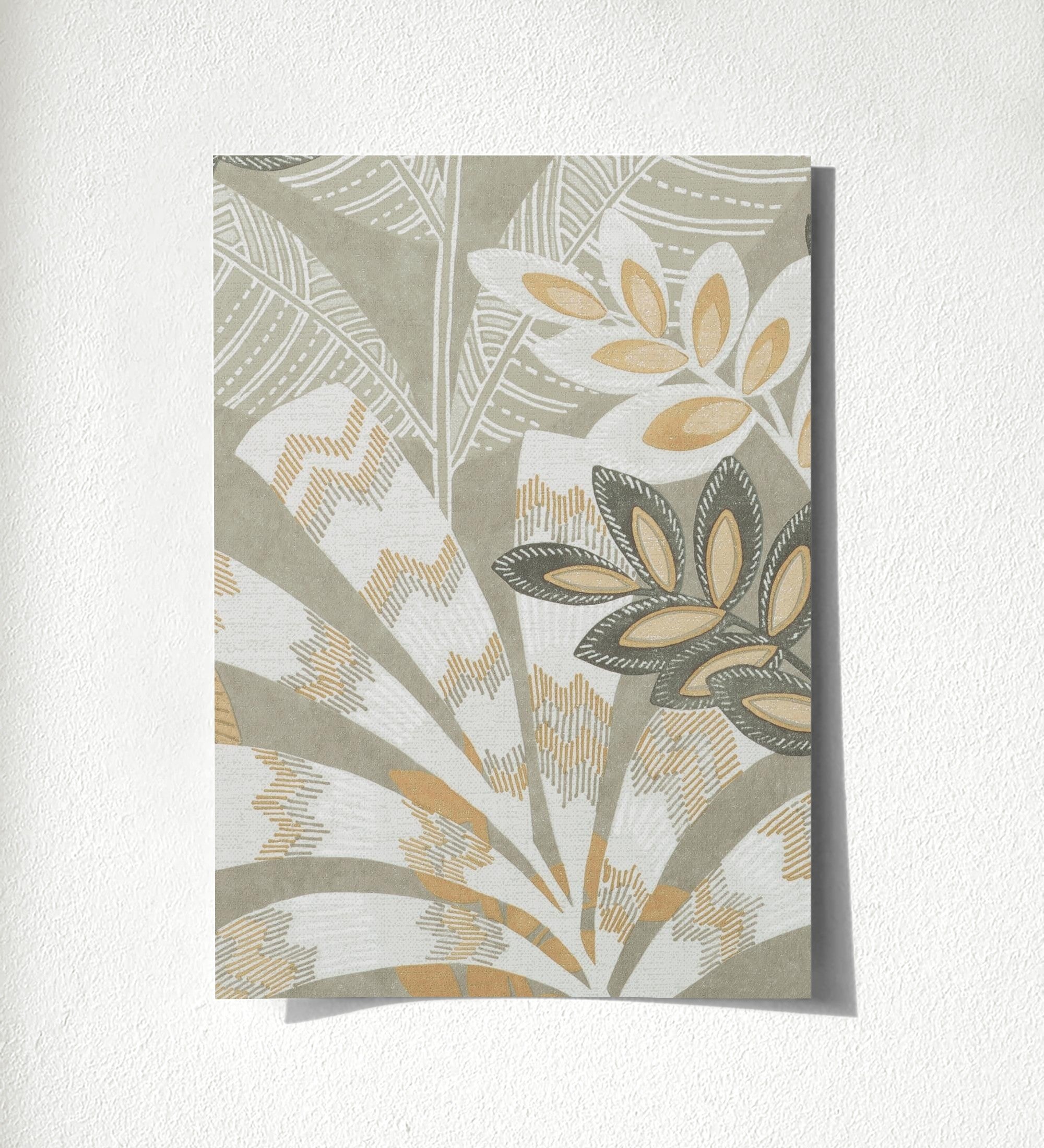 Échantillon DIN A4 de Papier peint en vinyle feuilles ethniques sur fond gris texturé style tropical - Aruba Palm 682002 de GAULAN