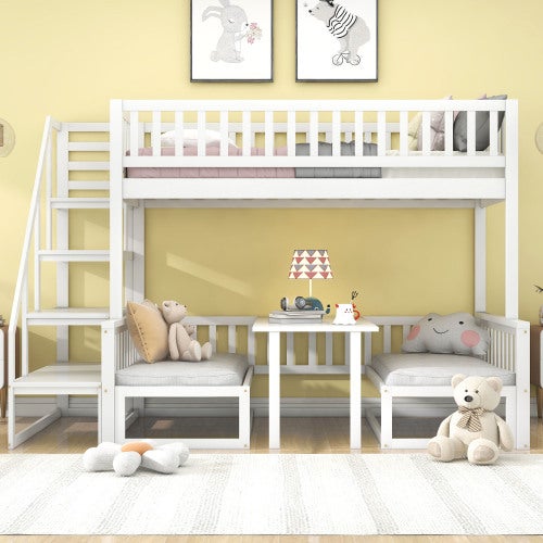 Lit superposé avec escalier, avec table réglable, avec canapé en bois, cadre en pin solide, blanc (90x200cm et 120 * 200cm)