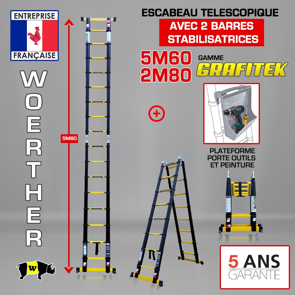 La société Française Woerther vous propose cette ÉCHELLE ALU TELESCOPIQUE 5M60 DOUBLE BARRES STABILISATRICES - WOERTHER - GAMME PRO GRAFITEK pour tous vos travaux de bricolage, aussi bien pour les particuliers que les professionnels. Avec le composant graphite, l'échelle alu télescopique Woerther devient l'une des meilleures du marché ! Avec sa garantie de 5 ans, elle est fournie avec sa barre stabilisatrice pour une meilleure sécurité au niveau du sol. Equipé du double système "Push & Go", cet escabeau télescopique renforce votre sécurité à l'aide de boutons poussoirs pour éviter les pincements de doigts et permet une meilleure répartition de la charge du corps en offrant une stabilité accrue avec ses embouts antidérapants. SPÉCIFICITÉS TECHNIQUES : Fonction échelle pliante : hauteur modulable de 280à 560cm Fonction escabeau : 280cm Finitions composées de graphite Verrouillage des paliers : automatique Normes européennes : EN-131-1, EN-131-2, EN-131-3 et EN-131-6 Lanière de fermeture Charge nominale : 150 kg Poids : 16,2 KG GARANTIE 5 ANS