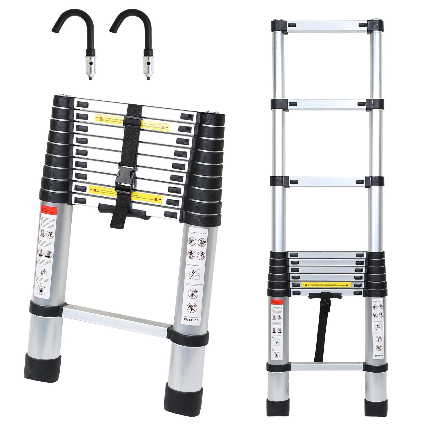 Échelle télescopique escabeau 2,6m argentée avec crochets amovibles, multifonction, 150kg