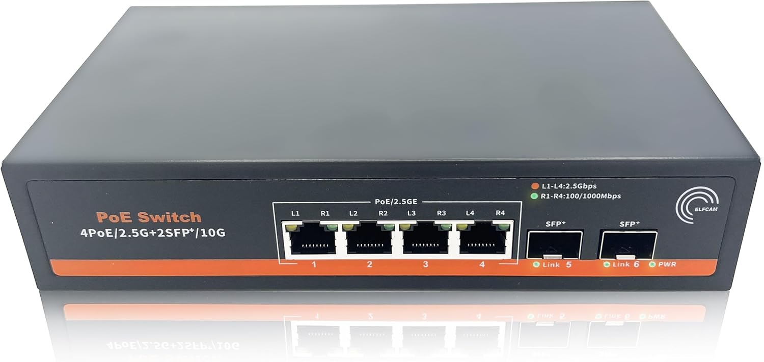 Elfcam – Switch PoE 10Gb/s Compatible Cisco, 2 Ports SFP+ 10G et 4 Ports RJ45 PoE 2,5G, Non Administrable Plug & Play