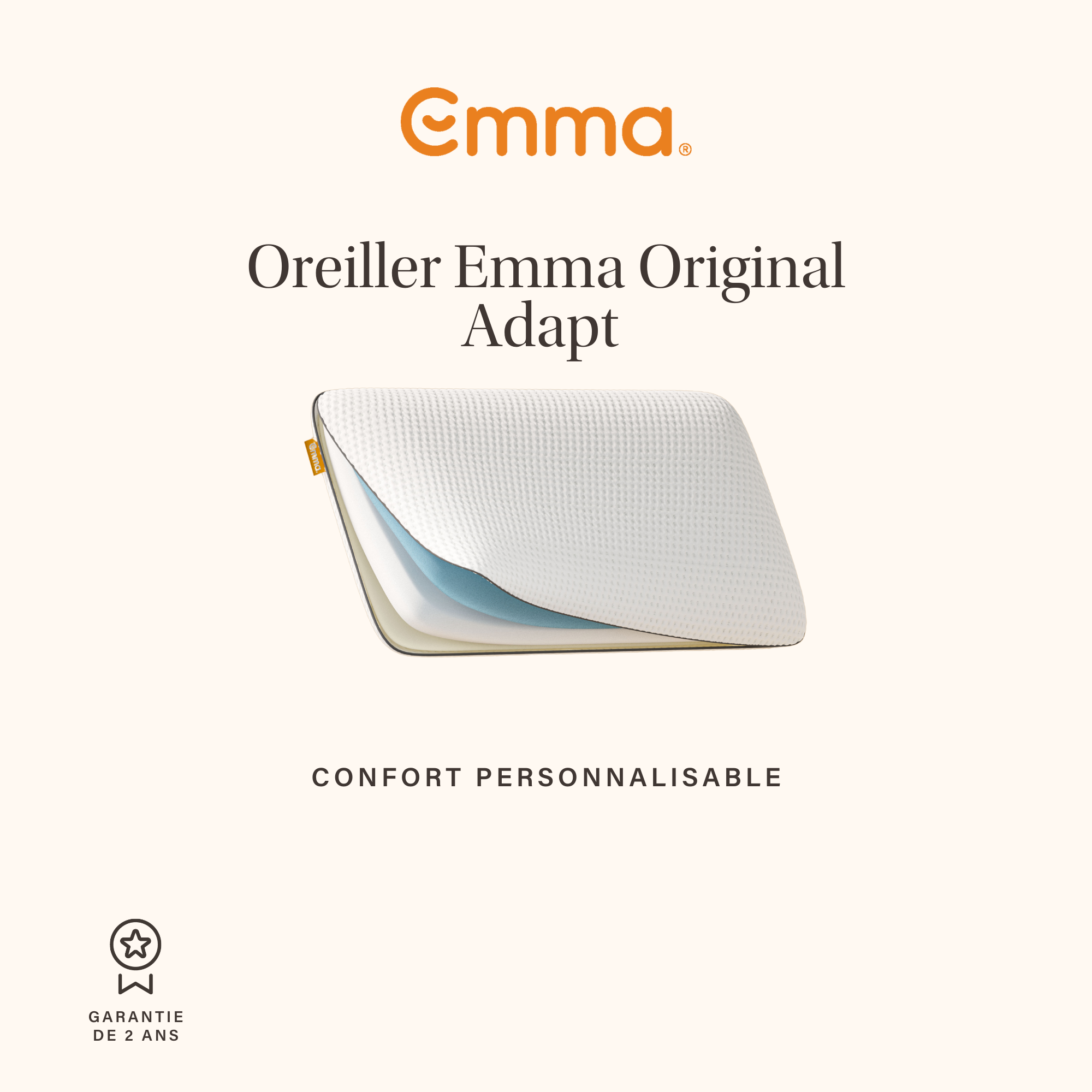 Oreiller Emma Original Adapt 70x40 cm L'oreiller le plus vendu Emma : un confort optimal ! Conçu pour mieux dormir Nous avons imaginé l'Oreiller Emma Original Adapt à mémoire de forme avec un seul objectif : créer un oreiller à mémoire de forme avec une hauteur personnalisable adaptée à chacun ! Ceci est rendu possible grâce à l'association extraordinaire de 3 épaisseurs de fermetés et de textures différentes.