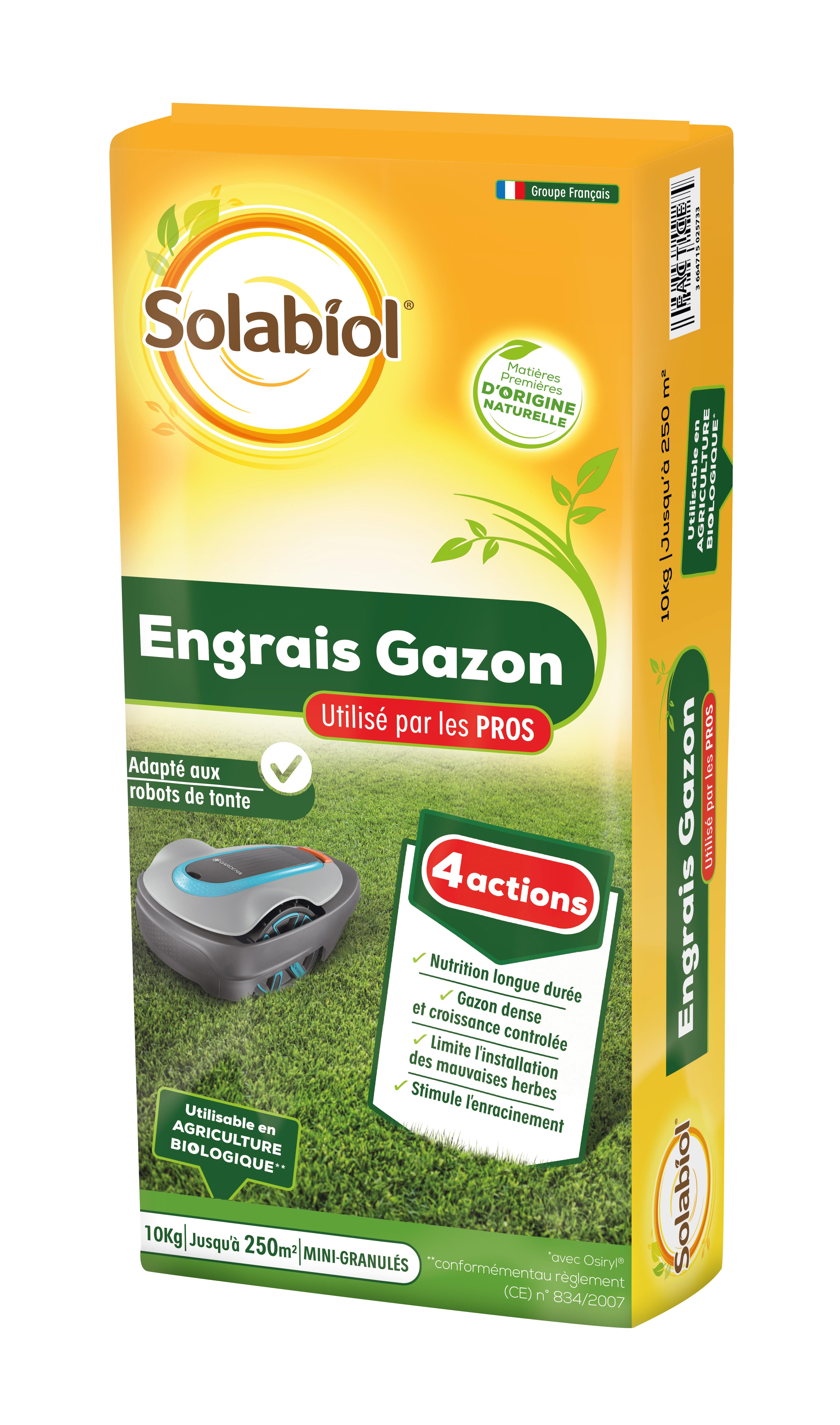 L’engrais gazon Solabiol utilisé par les pros nourri durablement le gazon. Sa formule contient le stimulateur racinaire Osiryl ainsi que des protéines végétales qui permettent aux gazons d’être denses et d’avoir une croissance contrôlée.