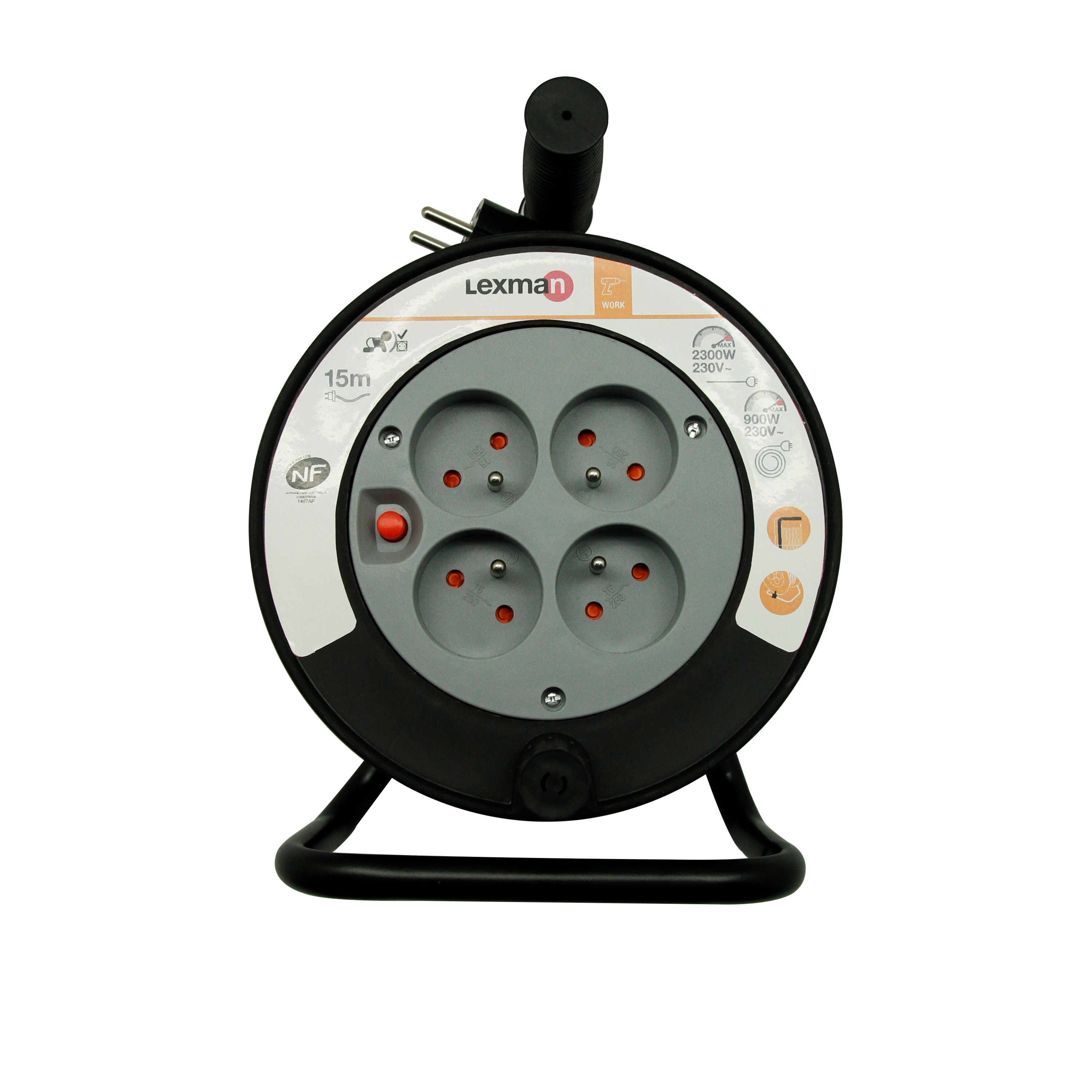 Cet enrouleur électrique LEXMAN est idéal pour bricoler. Il est facile à enrouler grâce à son système de guidage du câble. Equipé d'un fusible thermique, il coupe l'alimentation électrique en cas de surchauffe. Longueur de cable : 13m+2m de rallonge. Nombre de prises avec terre : 4.