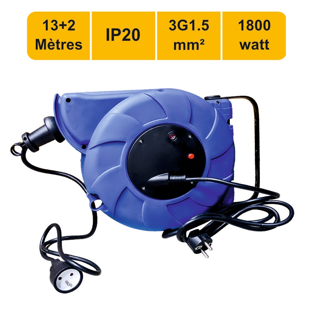 Enrouleur mural auto - câble de 13m H05VV-F 3G1.5 mm² + 2m câble d'alimentation