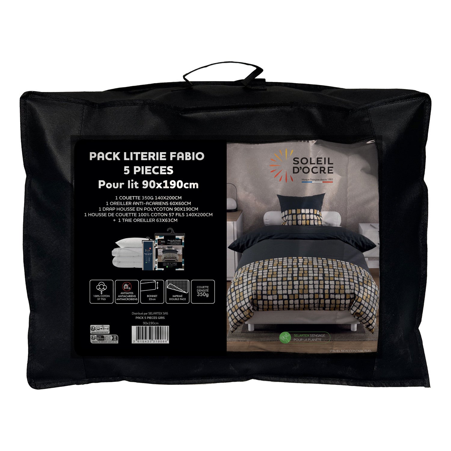 Voir les produits de la même catégoriePack complet de literie pour lit 1 place en 90x190 cm (5 Pieces). Prix malin. Couleur: Gris. Se compose de: - 1 Couette blanche DOUCEUR 140x200 cm (Enveloppe: microfibre, 350 gr). - 1 Oreiller blanc CONFORT 60x60 cm Anti-acarien (Enveloppe: microfibre, Garnissage: fibre creuse siliconnée 550 Gr). - 1 Drap housse 90x190 cm ZZZ lin (55% polyester, 45% coton), Bonnet de 25 cm.. - 1 Housse de couette imprimée grise 140x200 cm en coton 57 Fils/cm2, finition bouteille. - 1 Taie d'oreiller imprimée grise 63x63 cm en coton 57 Fils/cm2 (dessin placé).