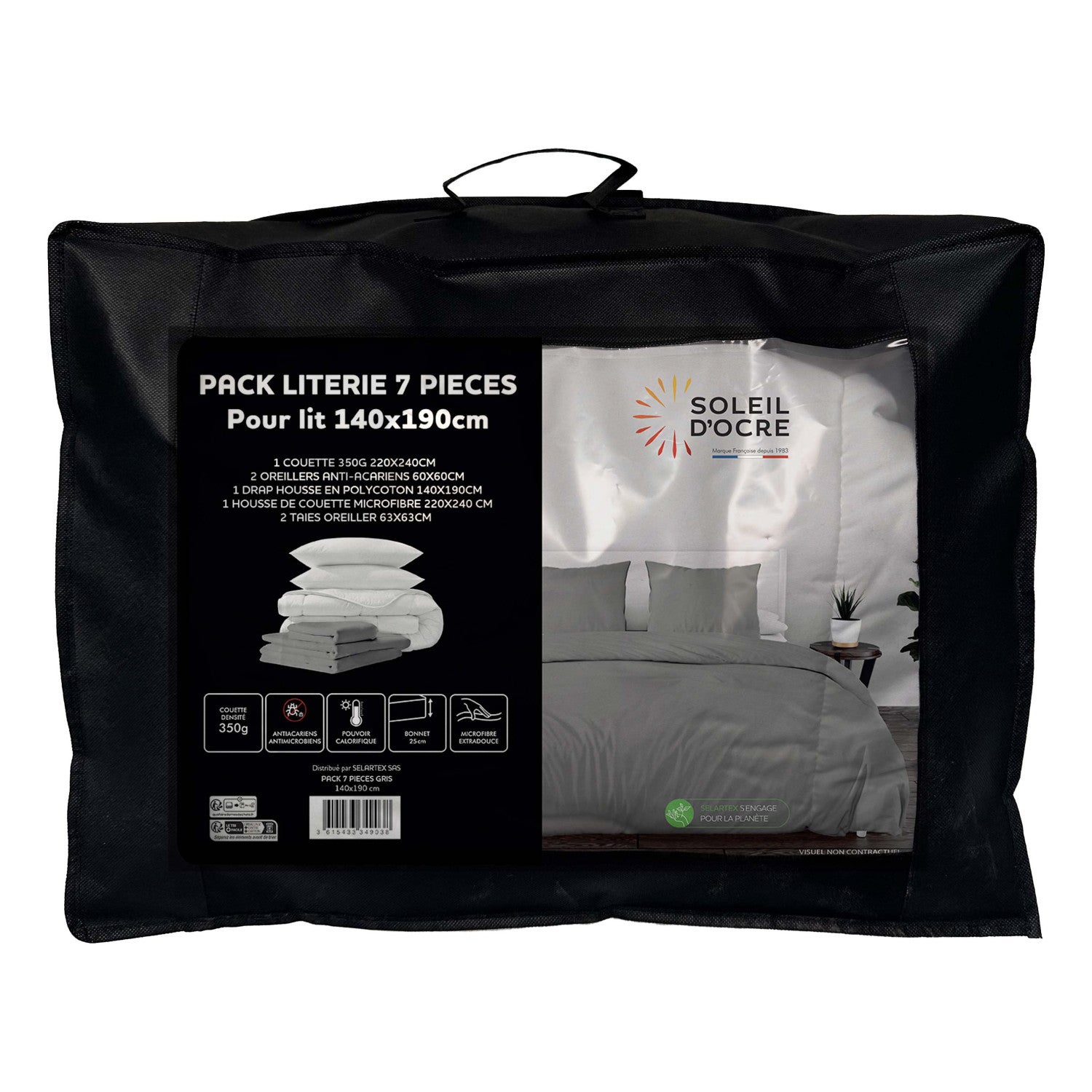 Voir les produits de la même catégoriePack complet de literie pour lit 2 places en 140x190 cm (7 Pieces). Prix malin. Couleur: Gris. Se compose de: - 1 Couette blanche DOUCEUR 220x240 cm (Enveloppe: microfibre, 350 gr). - 2 Oreillers blancs CONFORT 60x60 cm Anti-acarien (Enveloppe: microfibre, Garnissage: fibre creuse siliconnée 550 Gr). - 1 Drap housse 140x190 cm ZZZ blanc (55% polyester, 45% coton), Bonnet de 25 cm.. - 1 Housse de couette grise 240x220 cm en microfibre lavée, très douce (Entretien facile, repassage inutile), finition boutons. - 2 Taies d'oreiller grise 63x63 cm en microfibre lavée, très douce (Entretien facile, repassage inutile).