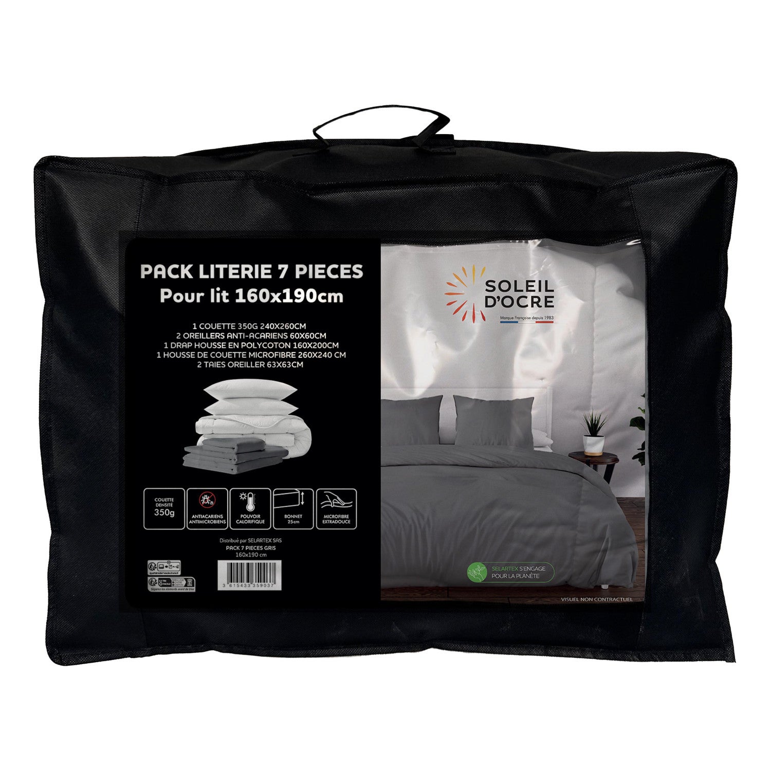 Ensemble couette et parure 7 Pièces BOHEME gris pour lit en 160x200 cm, par Soleil d'ocre