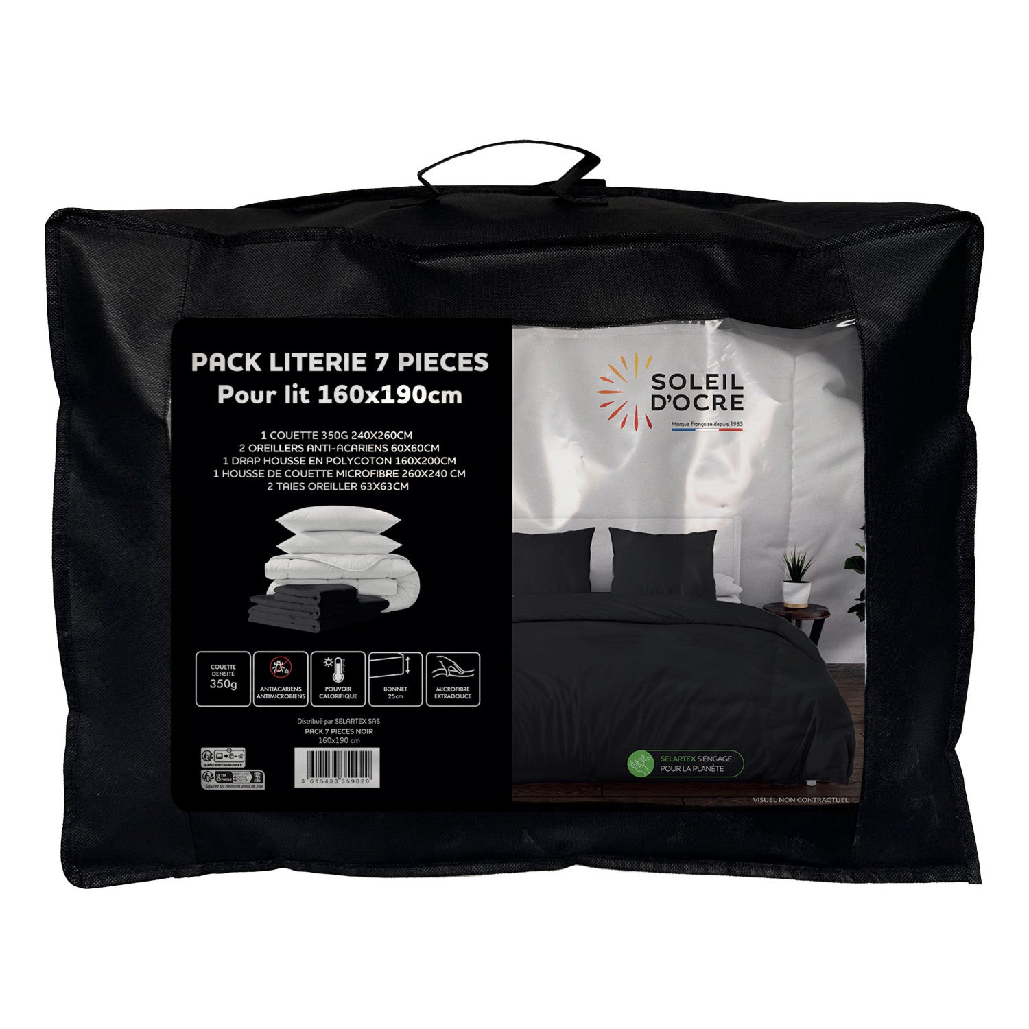 Voir les produits de la même catégoriePack complet de literie pour grand lit 2 places en 160x200 cm (7 Pieces). Prix malin. Couleur: Noir. Se compose de: - 1 Couette blanche DOUCEUR 240x260 cm (Enveloppe: microfibre, 350 gr). - 2 Oreillers blancs CONFORT 60x60 cm Anti-acarien (Enveloppe: microfibre, Garnissage: fibre creuse siliconnée 550 Gr). - 1 Drap housse 160x200 cm ZZZ noir (55% polyester, 45% coton), Bonnet de 25 cm. - 1 Housse de couette noire 240x260 cm en microfibre lavée, très douce (Entretien facile, repassage inutile), finition boutons. - 2 Taies d'oreiller noire 63x63 cm en microfibre lavée, très douce (Entretien facile, repassage inutile).