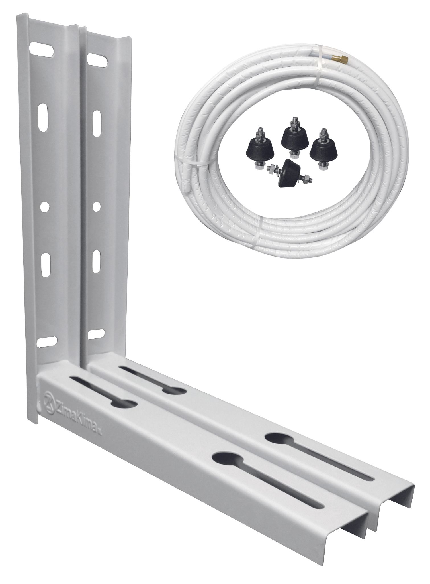 Contient une paire de supports soudés de 450x450 mm, un double tube en cuivre isolé 1/4" - 3/8" de 3 mètres, évasé avec écrous et un jeu d'amortisseurs.