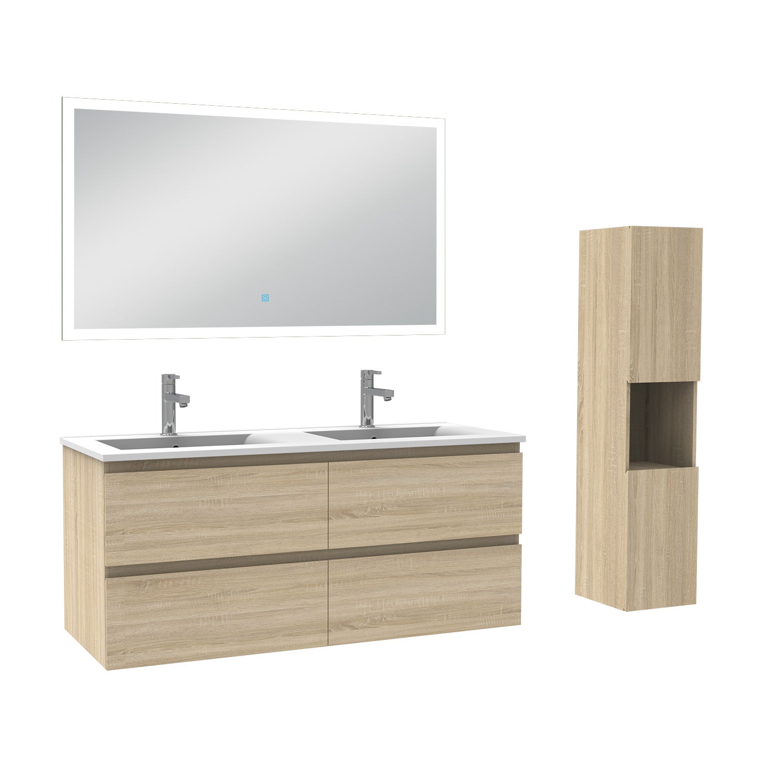 Ensemble meubles Salle de Bain 120cm double vasque + colonne + miroir lumineux Chêne Wotan - OCEAN