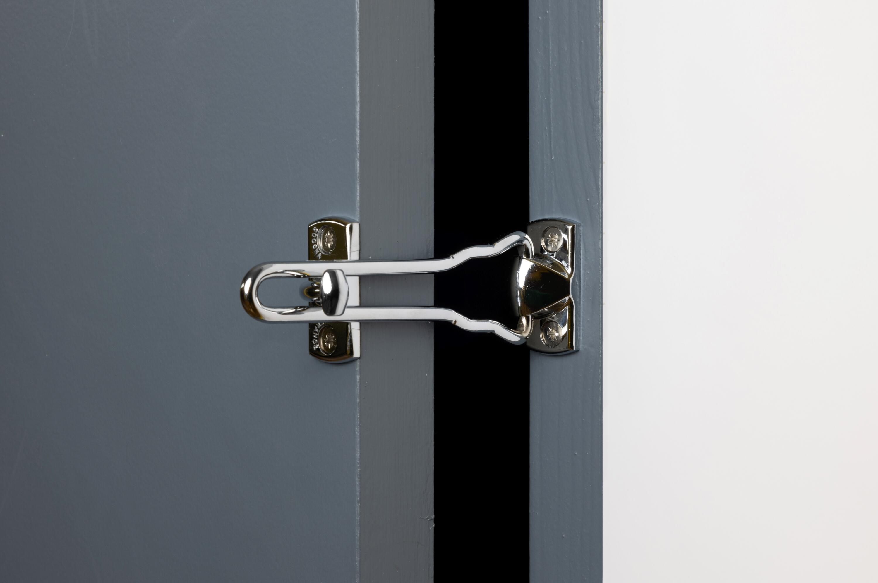 Entrebailleur de sécurité pour porte d'entrée, coulisse en fil acier. Visserie fournies. incrochetable depuis l'extérieur