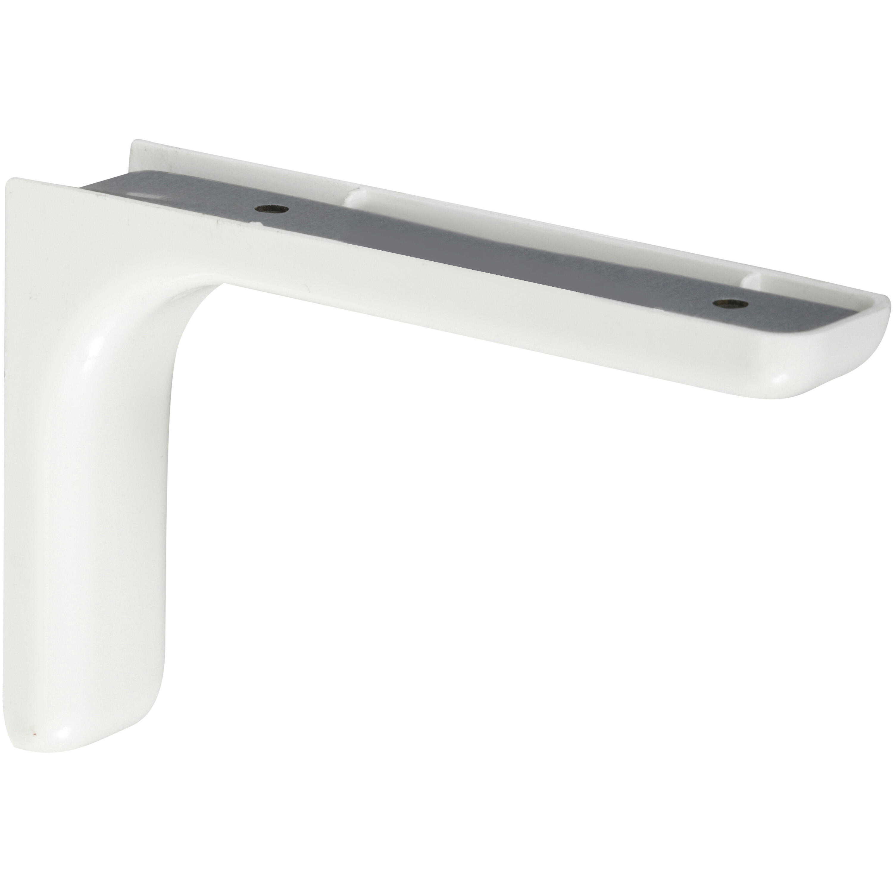Équerre Léonard en acier et plastique blanc. A visser au mur. Équerre en deux parties permettant de dissimuler les fixations. Charge maximale supportée 20 kg/paire. Dimensions : Largeur 36 mm. Hauteur 114 mm. Profondeur 180 mm.