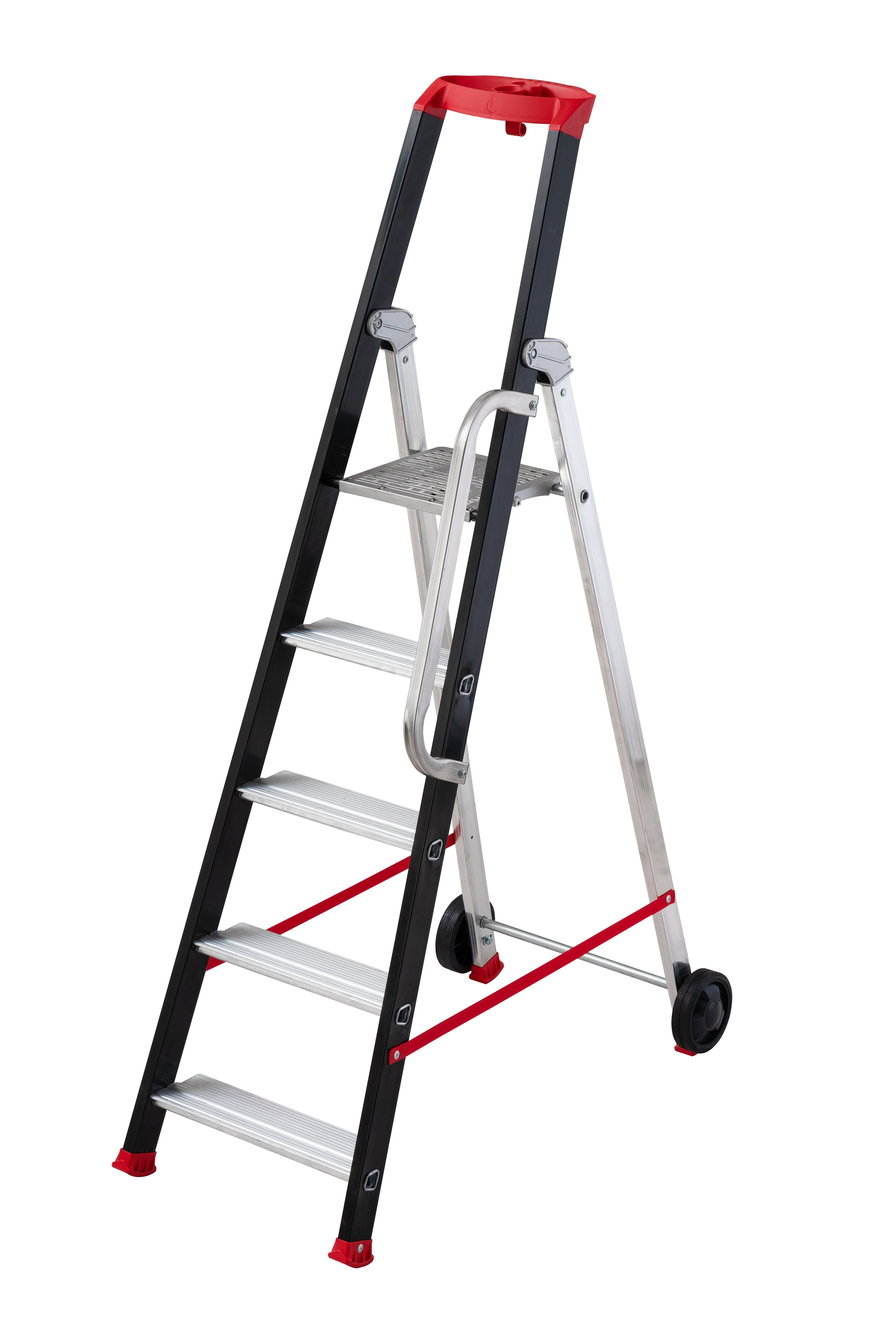 Escabeau professionnel de chantier HAILO 5 marches.Articulation et plateforme fonte d'aluminium Montants avant époxy. Tablette porte-outils multifonctions avec crochet seau Liaison marches / montants par sertissabe trapezoïdal Plateforme fonte alu ajourée avec biele centrale. Hauteur max d'accès : 3,35m. Norme EN131. Garantie 10 ans.