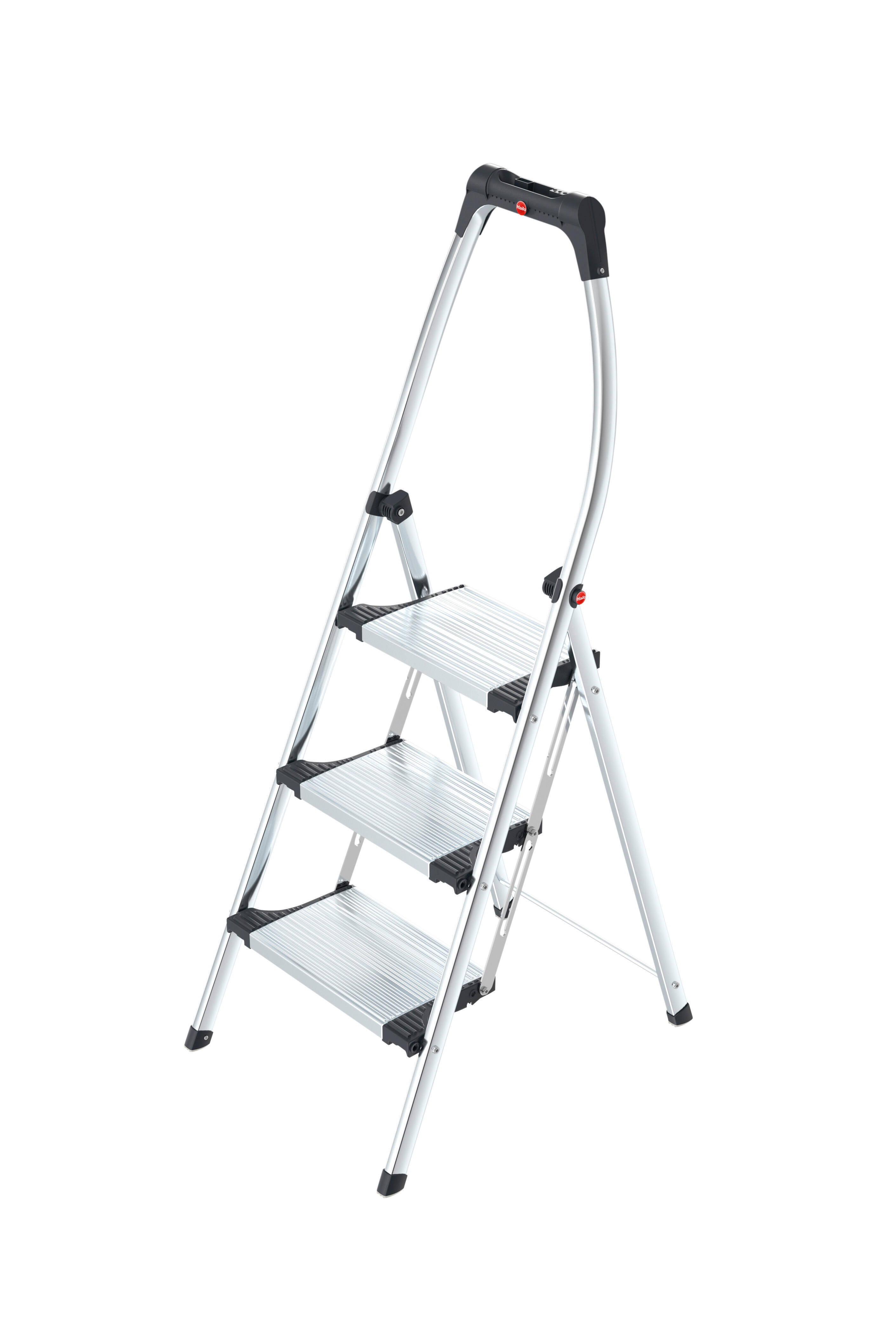 Marchepied pliable disposant d'un garde-corps en aluminium incurvé pour s'accrocher et s'appuyer, d'un porte-outils intégré, de marches larges antidérapantes (23 cm) pour un confort optimal et d'embouts avec semelles Soft Grip pour une meilleure stabilité sur différents types de sols (plancher, carrelage, moquette...).